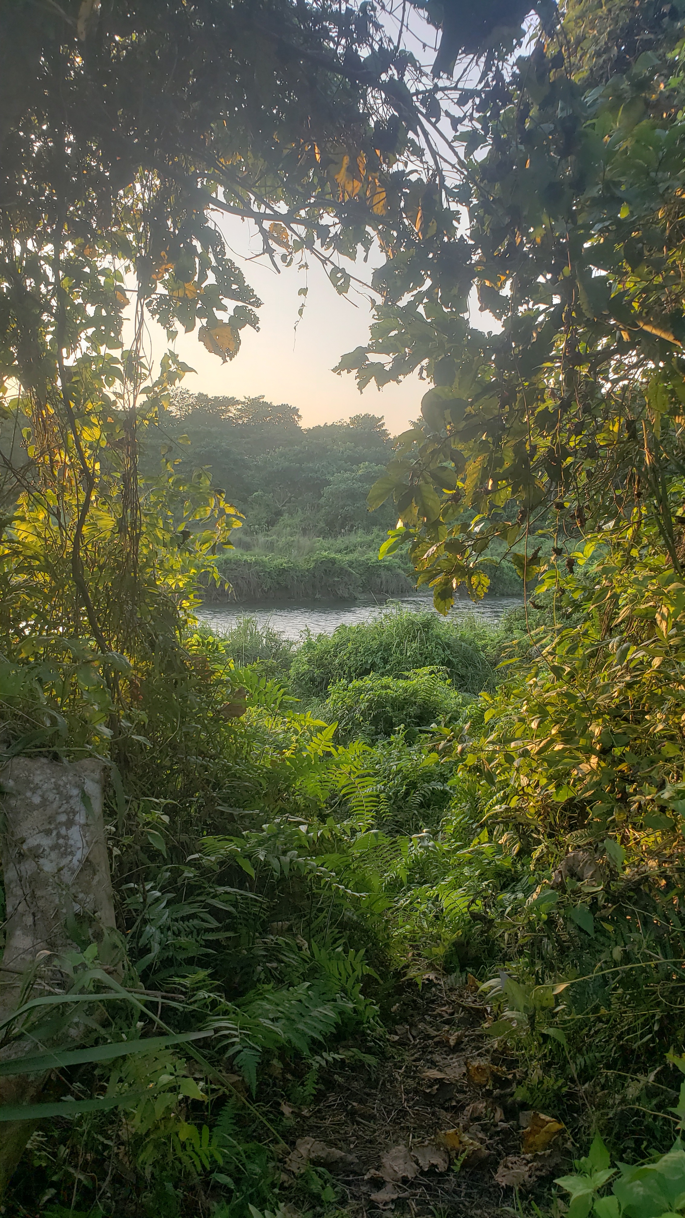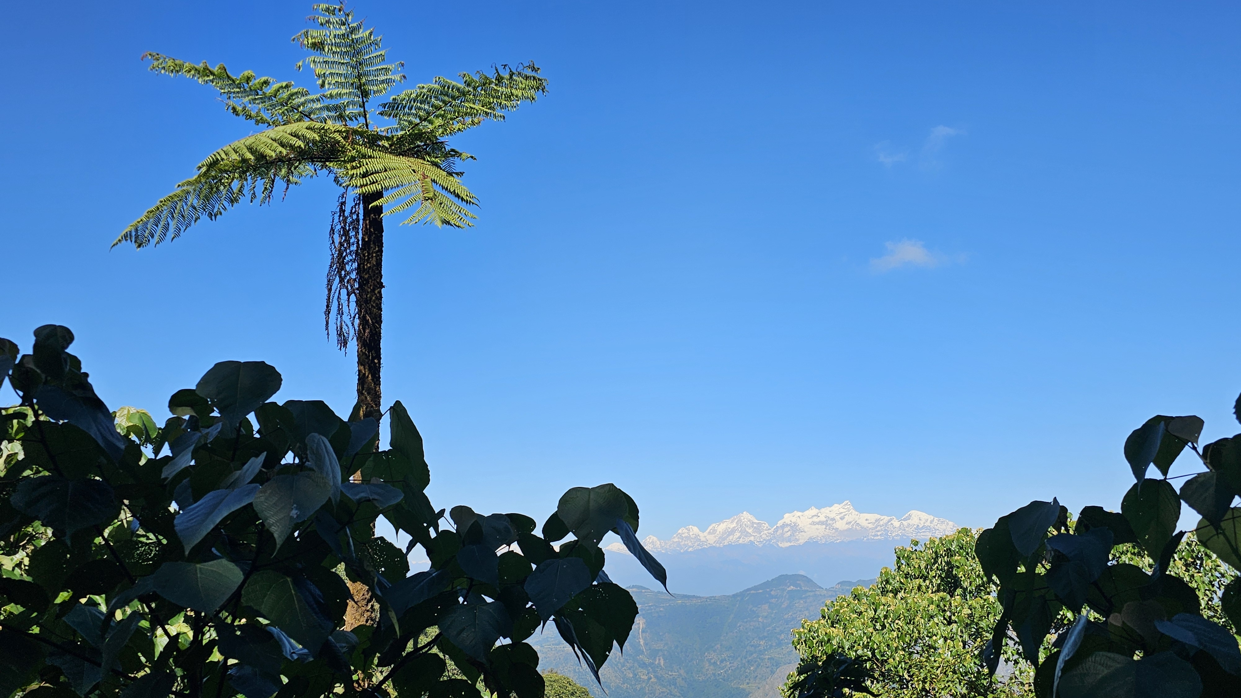On se lève avec le soleil et une superbe vue. Nous partons faire le transect dans le vallon sauvage de Chisapani, cette fois en changeant les rôles. Ce vallon est au coeur de notre projet puisqu’il abrite le Garrulaxe à ailes rouges, un oiseau que l’on pensait totalement disparu du Népal depuis plus de 70 ans, avant de se rendre compte qu’il en existait encore une petite population juste là, dans ce coin de forêt préservé. L’ambiance de ce vallon est incroyable, on a l’impression de pénétrer dans une forêt primaire authentique, avec des effets de rayons lumineux qui jouent dans les feuillages luxuriants, et des chants et cris d’oiseaux partout. On remarque plusieurs écureuils dans les hauteurs, ainsi que plusieurs Langhurs du Teraï. On voit des multitudes de Barbus géants, de grands oiseaux au plumage vert et bleu. Arrivés en bas du transect, on prend le temps de caractériser une fougère arborescente avec une clé d’identification imprimée et on la prend en photo dans tous les sens. On espère pouvoir ainsi identifier l’espèce à coup sûr, en faisant valider par les chercheurs spécialisés en fougères arborescentes. Au Népal, toute donnée de fougère arborescente est précieuse pour les avancées des recherches car elles sont rares. Puis on remonte le vallon tout en récupérant en chemin les enregistreurs audio automatiques qui avaient stratégiquement été placés à 3 endroits différents lors de l’expédition précédente (il y a donc 2 ans). Ces enregistreurs servent à compléter nos données de présence des oiseaux dans ce vallon, après analyse des chants et cris enregistrés. Petite déception, l’un des 3 enregistreurs a disparu. Nous retrouvons sur le tronc qui le portait des coups de hache, qui témoignent qu’un local a du tomber dessus et le retirer, ne sachant pas ce que c’est…