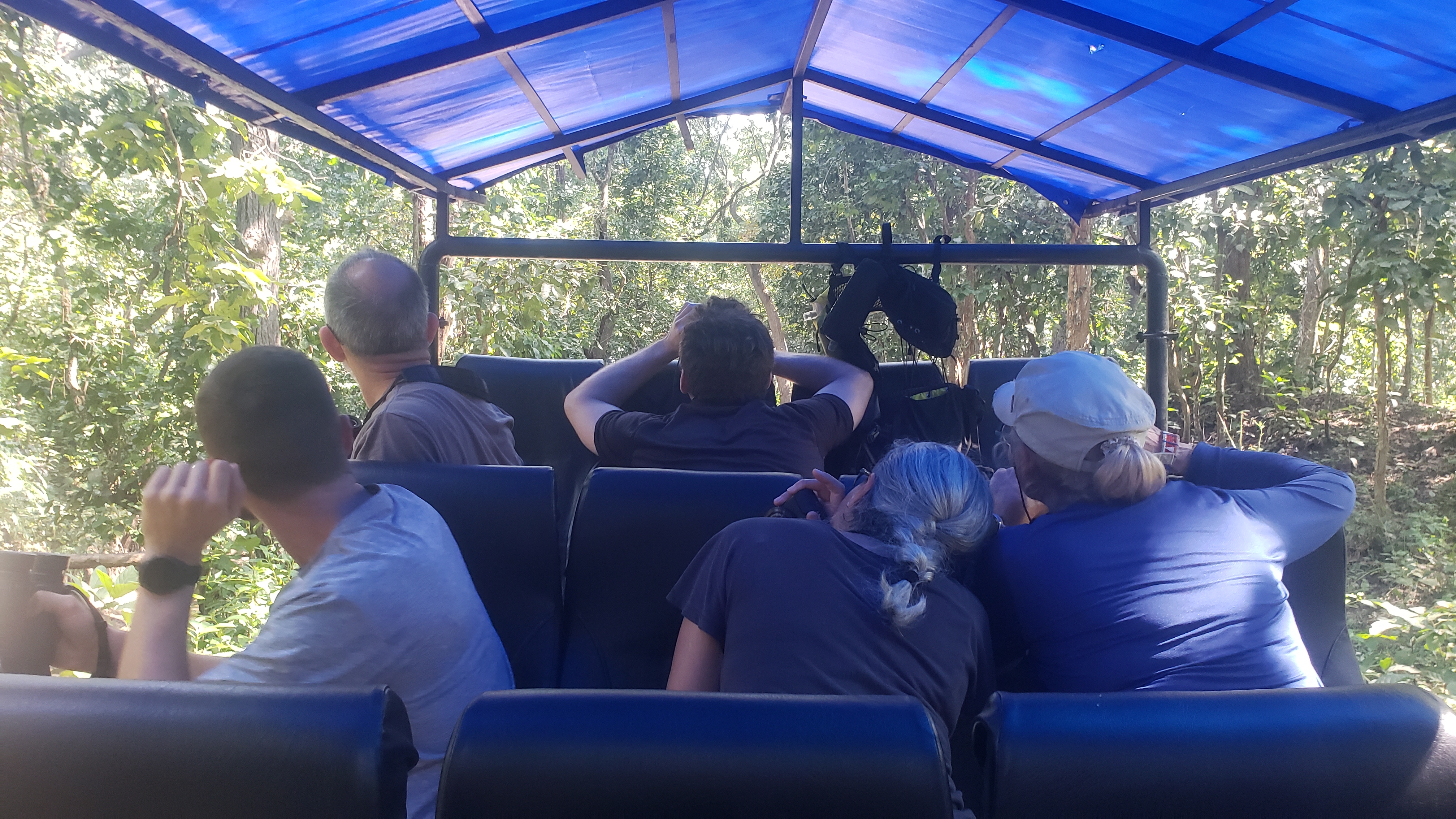 C’est à cet endroit que l’on décide de faire notre initiation botanique. Après l’analyse de plusieurs rameaux sur lesquels nous apprenons un peu de vocabulaire basique, on se lance dans une clé d’identification créée de façon participative avec les groupes des séjours précédents. On identifie ainsi le Sal tree, arbre dominant de cette jungle. Puis nous caractérisons un nouvel arbre : « Terminalia tomentosa » en remplissant sa fiche de description. C’est un arbre dont on connaît le nom scientifique, mais nous n’avions pas encore eu l’occasion de remplir sa fiche descriptive car les feuilles se trouvent trop souvent hors de portée. Voilà qui est fait, et nous voila repartis en jeep pour rentrer à l’hôtel avec encore une fois, plein de belles observations en chemin.