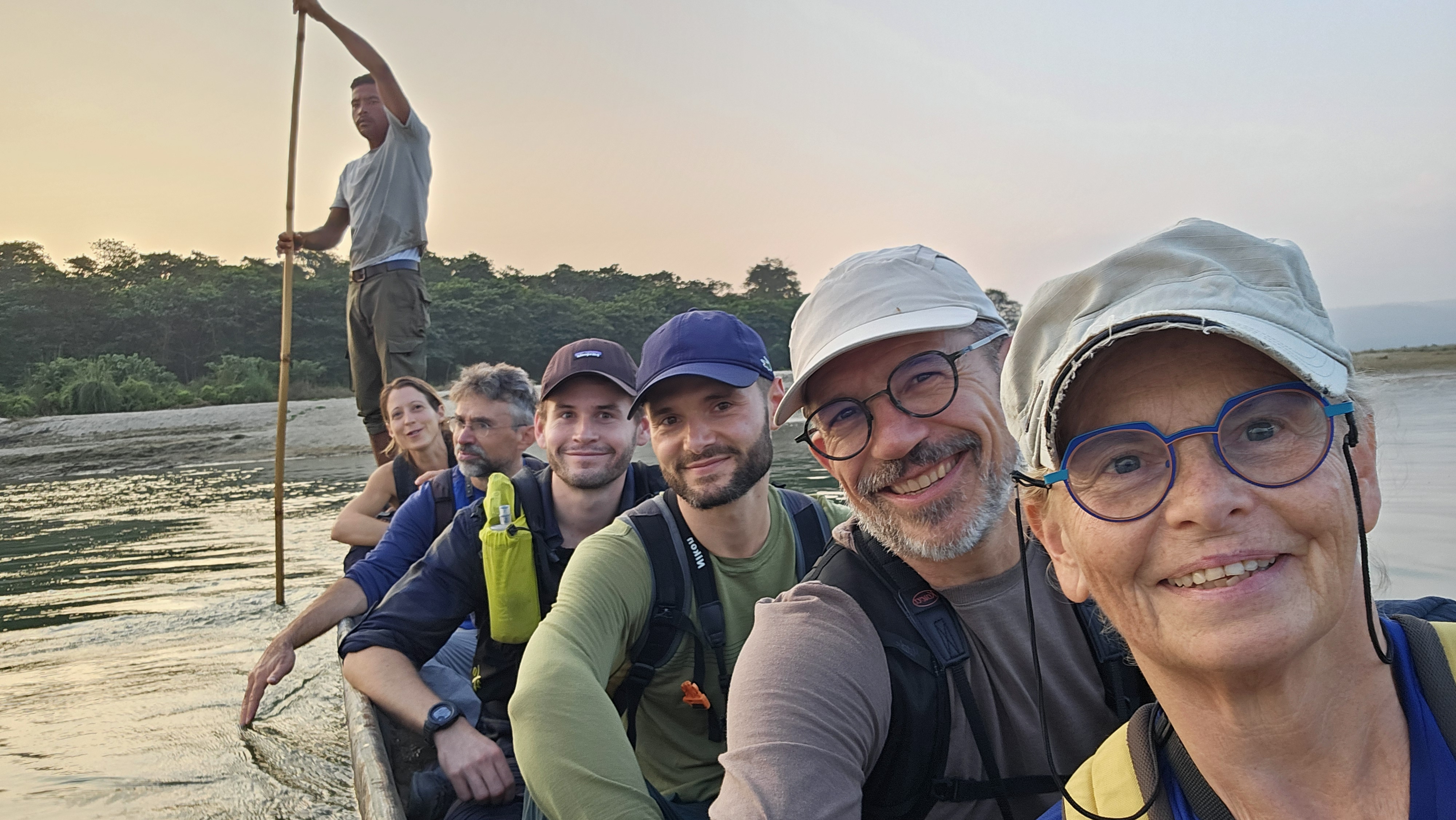 Levés dès 6h du matin pour un départ à 7h, juste après que la brume se dissipe et nous permette de rentrer dans la jungle en sécurité. Après la traversée de la rivière Rapti en pirogue, nous démarrons notre exploration encadrés par notre guide Bishnu (spécialiste des oiseaux, qui a été formé par Tika, le parrain de notre projet dans les Chepang Hills) et ses deux assistants qui assurent notre sécurité.