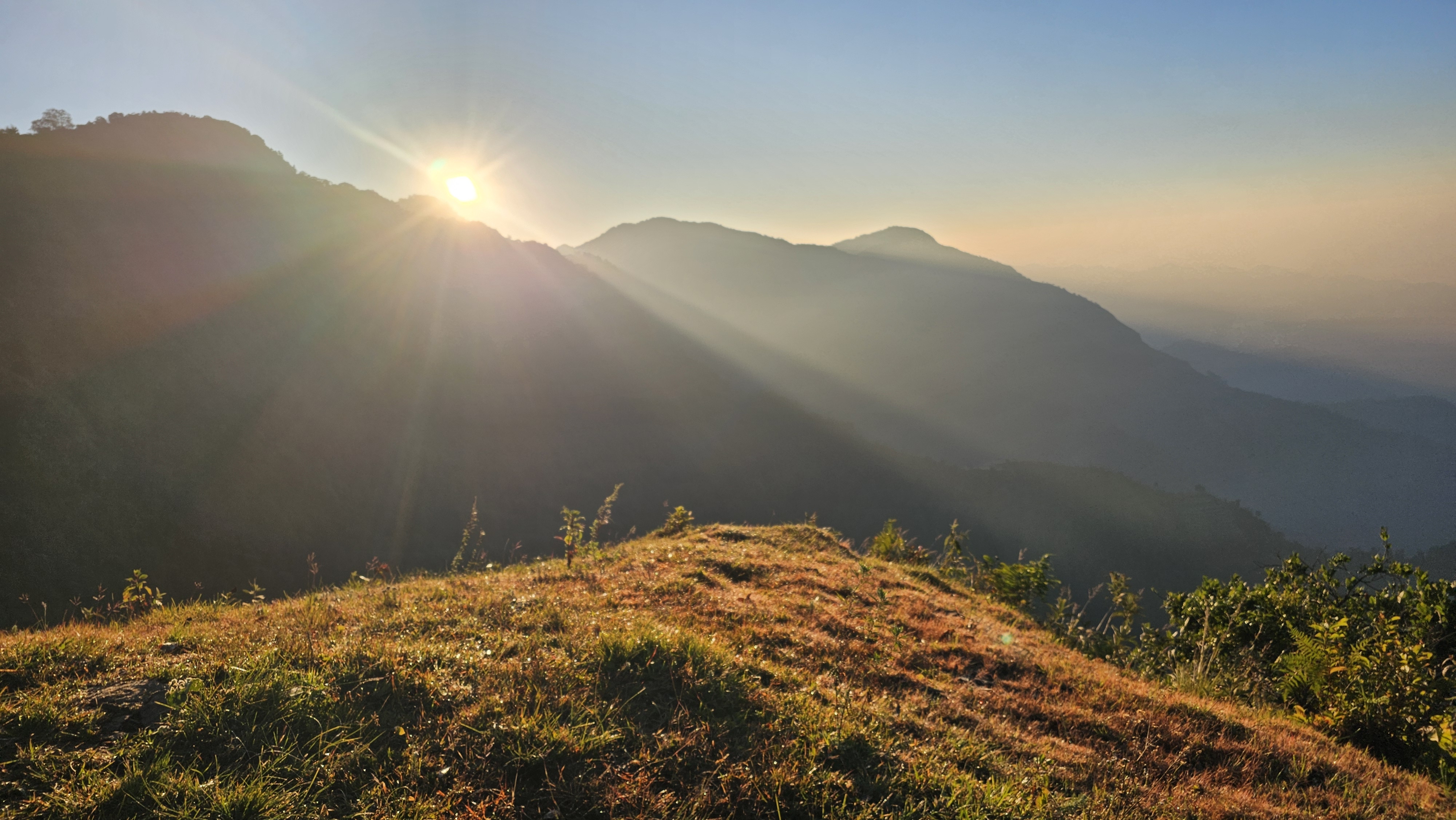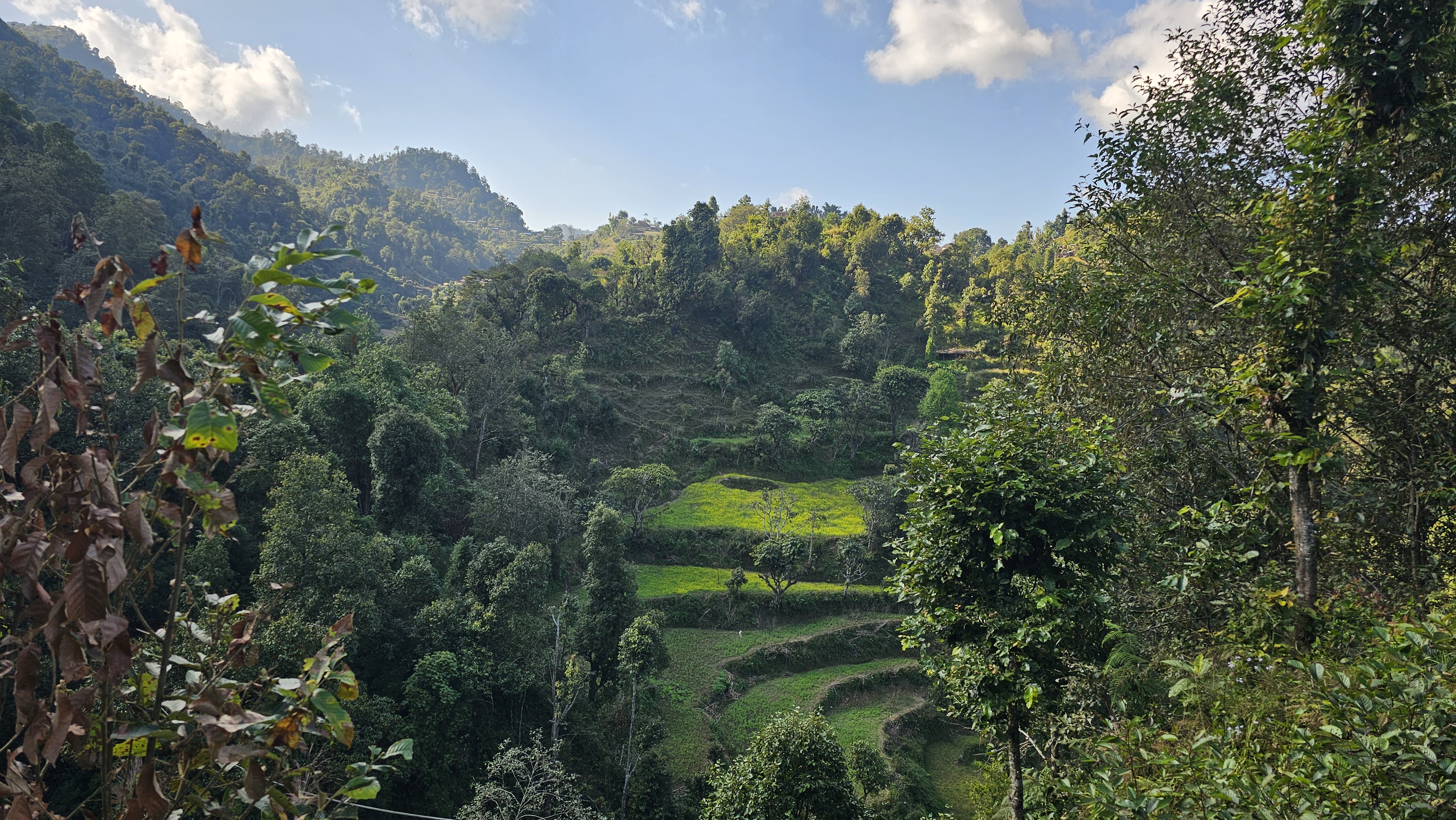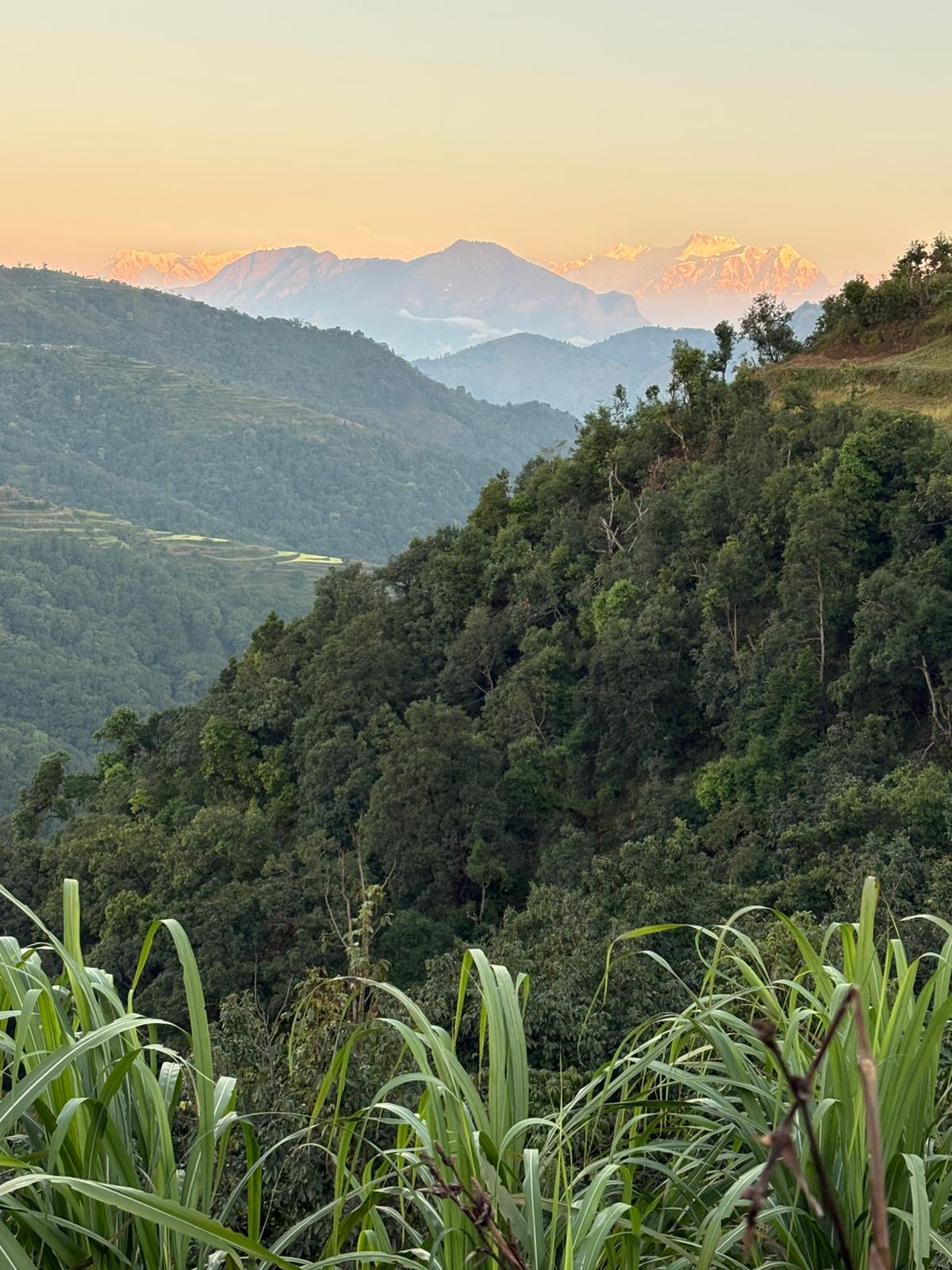 Ce matin on se réveille tranquillement avec le soleil, et le petit déjeuner prend des allures de festins avec les grenades préparées la veille qui subliment le mélange de porridge d’avoine au miel, muesli croustillant, graines de chia, noix et bananes. Le tout sur notre point de vue de bord de crête dont on ne se lasse pas. Puis on range le campement, et on termine la matinée par des petits temps de synthèse botanique, et la vérification de nos 2 premiers pièges-photos installés. En chemin pour vérifier le second, on a le plaisir de bien voir 5 à 6 Langurs du Teraï . Un dernier pique-nique et on quitte notre chouette camps de base, après quelques selfies de groupe pour le souvenir. La marche pour le prochain village se fait tranquillement, avec une pause pour caractériser l’habitat forestier de nouveau (cette fois le score est de 32 %, ce qui représente bien l’influence de la grosse piste et des activités humaines dans ce passage). On finit notre randonnée par une grande descente qui nous amène au village de Kaule, où nous sommes accueillis chez une famille avec des oranges cueillis dans leur jardin et du thé, lui aussi, cultivé dans le champs d’à côté. Kaule est un village incroyable, quasi auto-suffisant. On s’y promène de maison en maison, toutes très proches les unes des autres et séparées par de tout petits sentiers de terre, avec partout des fruits et légumes qui poussent en plein milieu du passage, ainsi que des poules, des chèvres, des buffles...et les habitants qui vivent sur leurs terrasses et nous accueillent avec de grands sourires. Après le thé, on s’installe et on a tout juste le temps de prendre une douche (au sceau et à l’eau froide) bien méritée et pour certains le temps de faire un peu de lessive avant l’heure du dal bhat. On a même la chance de goûter des « barela » !Effectivement, dans la descente vers Kaule, une dame s’est empressée d’offrir ces légumes à Jean-Marc qui les regardait curieusement. On les a donc donné à la famille qui nous les a cuisinés. Après un bon thé, chacun se prépare à dormir. Alors qu’il n’y avait plus que Annie, Sylvain et Catherine à table, Rupen leur fait remarquer qu’il y a une séance de shaman en cours car on entend les percussions au loin. De façon complètement improvisée, il les emmène voir la cérémonie pendant laquelle ils partagent le thé avec la famille, un grand moment de vie d’une autre culture, passionnant.