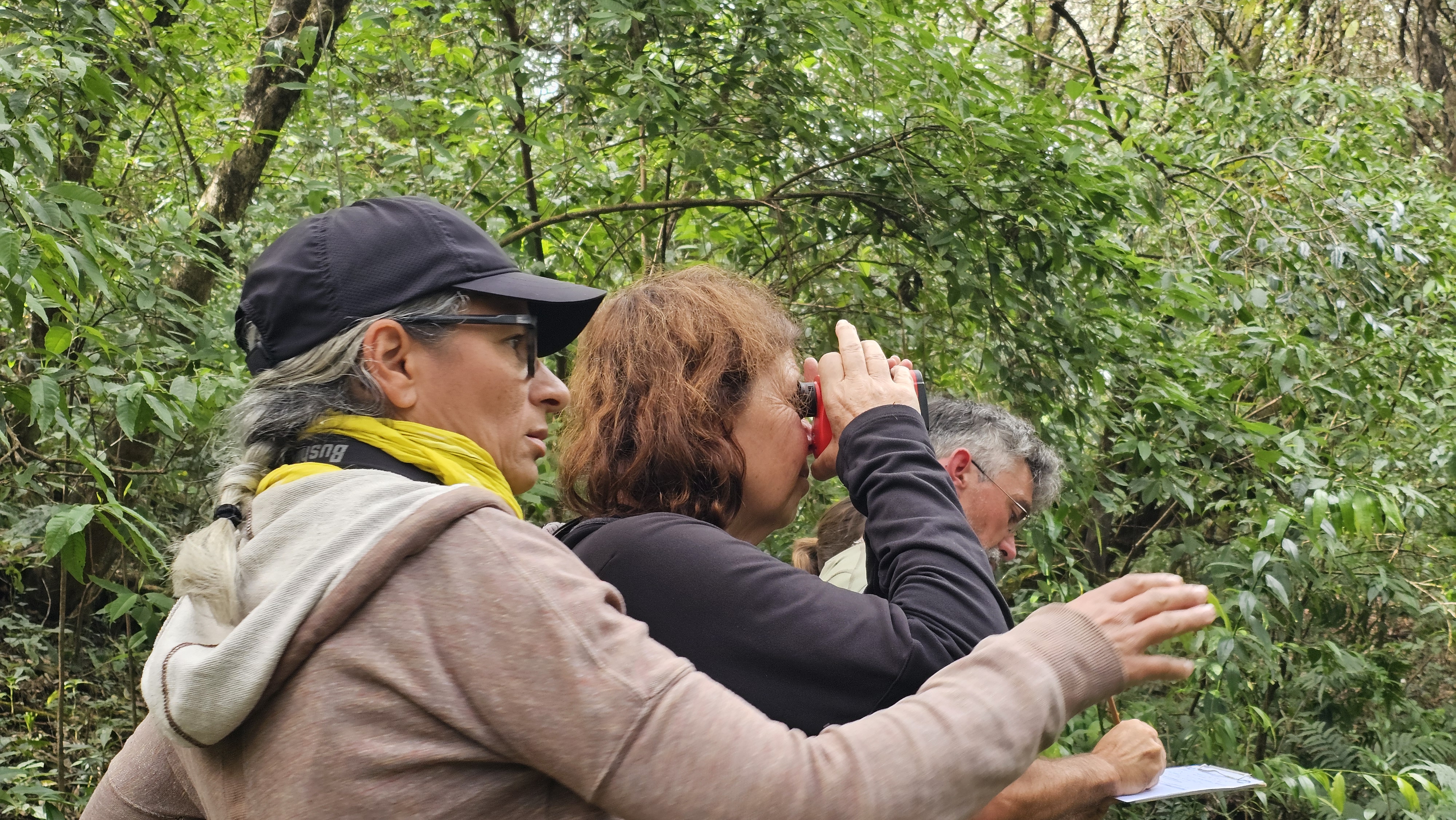 Rupen et Nicolas repèrent les oiseaux aux jumelles, suivis par Sylvain qui tente de les photographier, puis de Brigitte qui enregistre tous les cris et chants, d’Alexis qui enregistre avec l’application Merlin pour aider à orienter les identifications possibles, de Jean-Marc qui tient prêt le livre d’ornitho de référence ainsi que les fiches de terrain de description des oiseaux inconnus, et enfin le binôme qui dépote : Annie sur la prise de données papier et Evelyne sur la prise de données numérique (via l’application Obsmapp), et Catherine qui chapeaute le tout pour assurer que les informations aient bien circulé dans l’ensemble du groupe.