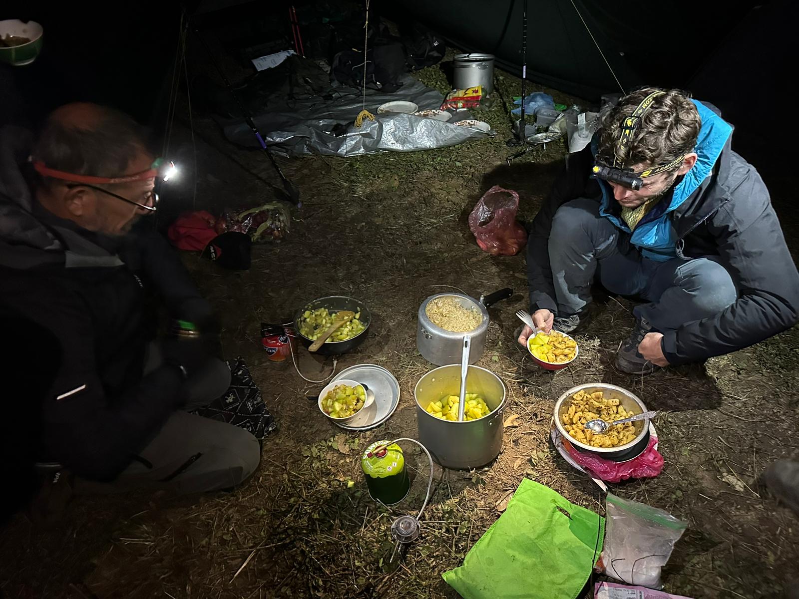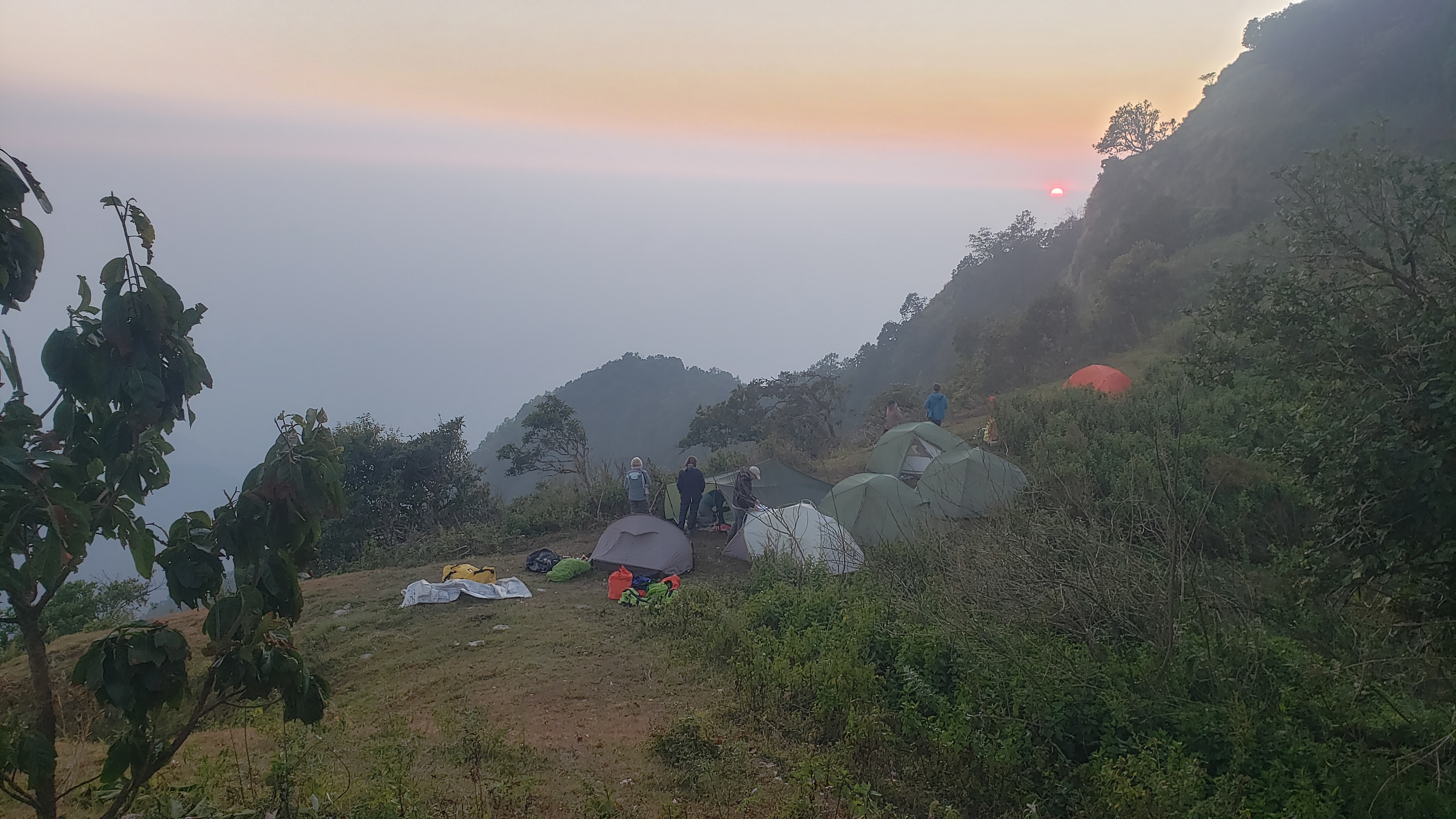 Ce matin nous partons avec nos gros sacs pour aller installer notre camps de base à Chisapani, à l’entrée du vallon sauvage dans lequel habite le Garrulaxe à ailes rouges, cet oiseau super rare au Népal que l’on pensait disparu du pays depuis plus de 70 ans avant de retrouver une petit population juste ici, dans ce petit vallon. Dans la montée, nous réalisons un transect. Nous repérons une Mésange sultane, un oiseau super rare. Même Rupen nous dit que ce n’est que la 2e fois qu’il la voit, et que ça faisait partie de ses grandes envies de pouvoir le revoir. A l’arrivée à Chisapani, gros bouleversement : tout pile dans la petite clairière on comptait installer nos tentes comme à chaque expédition, une énorme retenue d’eau avec des murets de pierre et des escaliers pour y descendre a été construite. Il semblerait que ce soit uniquement à utilisation du bétail. Personne ne comprend cette absurdité, étant donné qu’on est loin de tout village, et que le bétail peut très bien aller boire dans le vallon où l’eau ruisselle partout. Bon, clairement, on ne pourra pas installer notre camps là. Au final, en cherchant un peu aux alentours, on trouve sur le bord de la falaise un espace plat, mais il reste encore à le défricher. Mais avec l’énergie du groupe, tout le monde se met à cette séance de jardinage impromptue, et finalement on réussit à s’installer avec un avantage certain par rapport à l’autre lieu de bivouac prévu : la vue géniale sur la vallée en contrebas. Avant que la nuit ne tombe, on va faire 2 fiches de description de 2 nouveaux arbustes. Puis on se cuisine un dîner de quinoa-petits légumes-cacahuètes. Sur la crête le brouillard s’accumule et on se refroidit vite. Le repas chaud fait vraiment du bien, et on va vite dormir après pour se mettre au chaud dans les duvets.