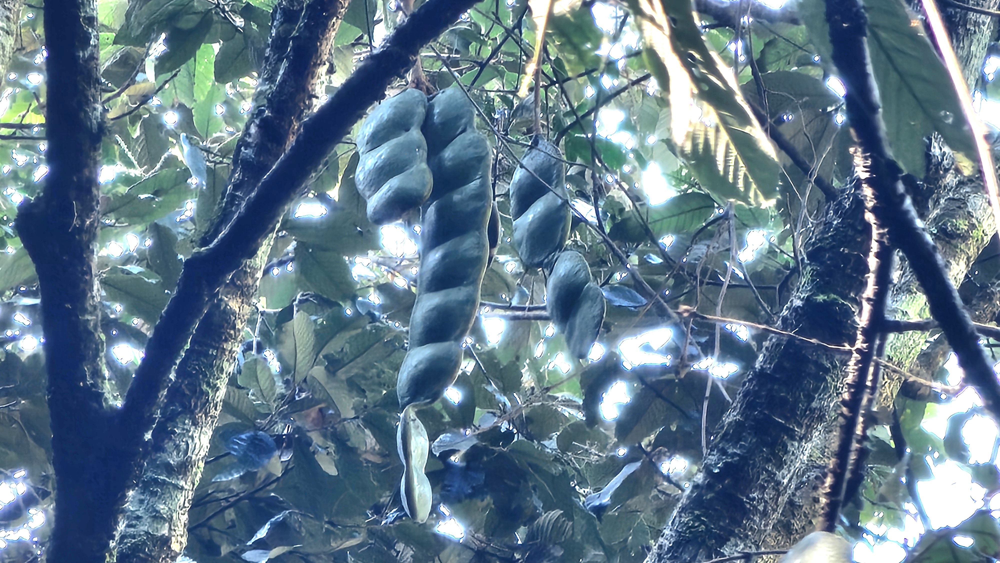 Et bien nous en a pris ! Alors que nous réalisons un protocole d’analyse de l’habitat forestier dans une forêt secondaire dominée par les châtaigniers Castanopsis indica, nous repérons une Liane étonnante, portant des gousses géantes d’au moins un mètre, suspendu tout en haut dans la canopée, puis les graines de cette plante, de la taille et la forme d’un palet de hockey sur glace. Une fois germé, les deux feuilles rudimentaires (« cotyledons »)s’écartent et cela ressemble à un macaron ! Une petite recherche nous mène sur la piste du genre Entada, qui comprend une espèce bien nommée le haricotier géant. Apparemment ces énormes graines sont comestibles une fois cuisinés, et sont même ingérés d’un coup par les calaos !