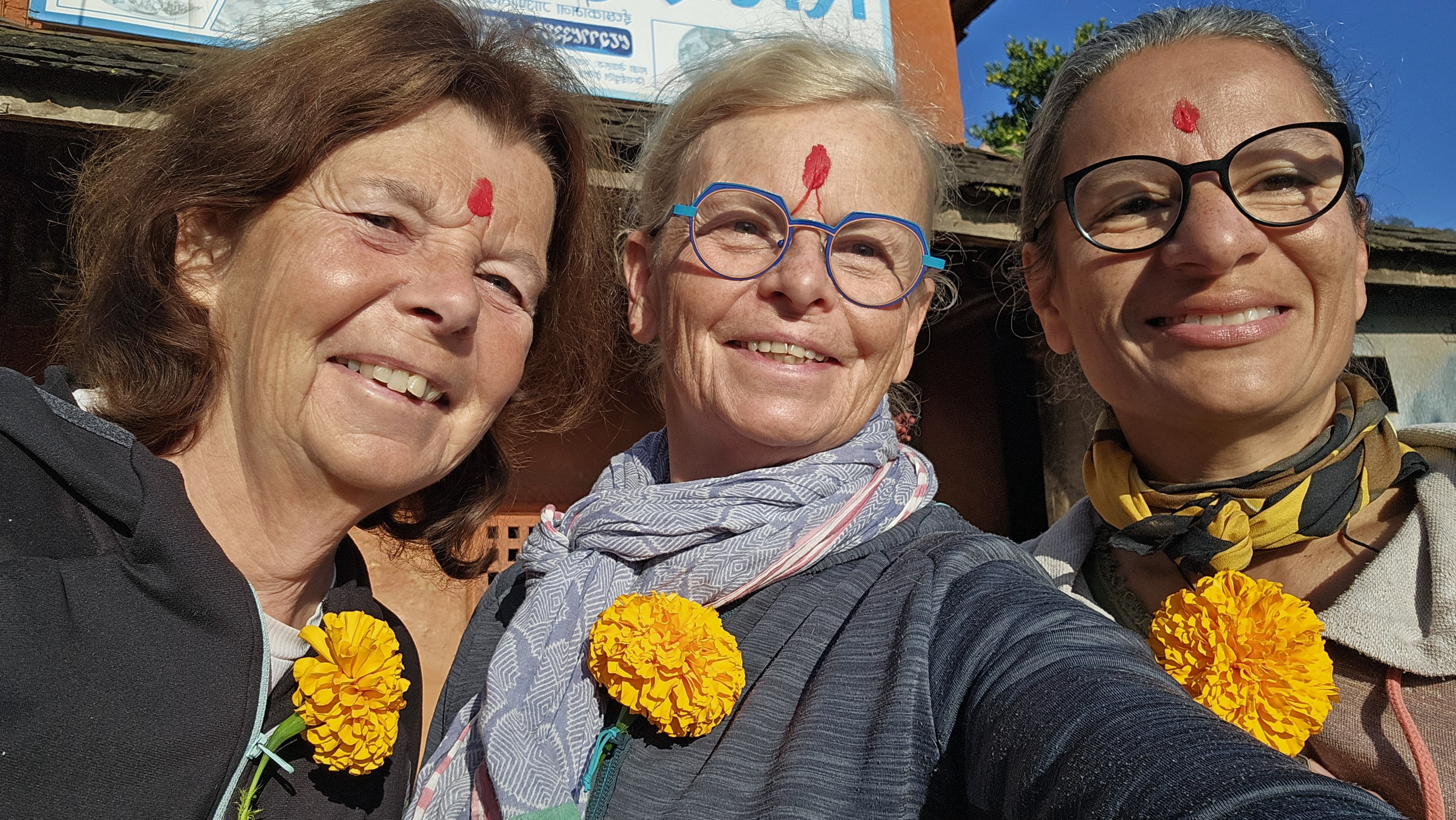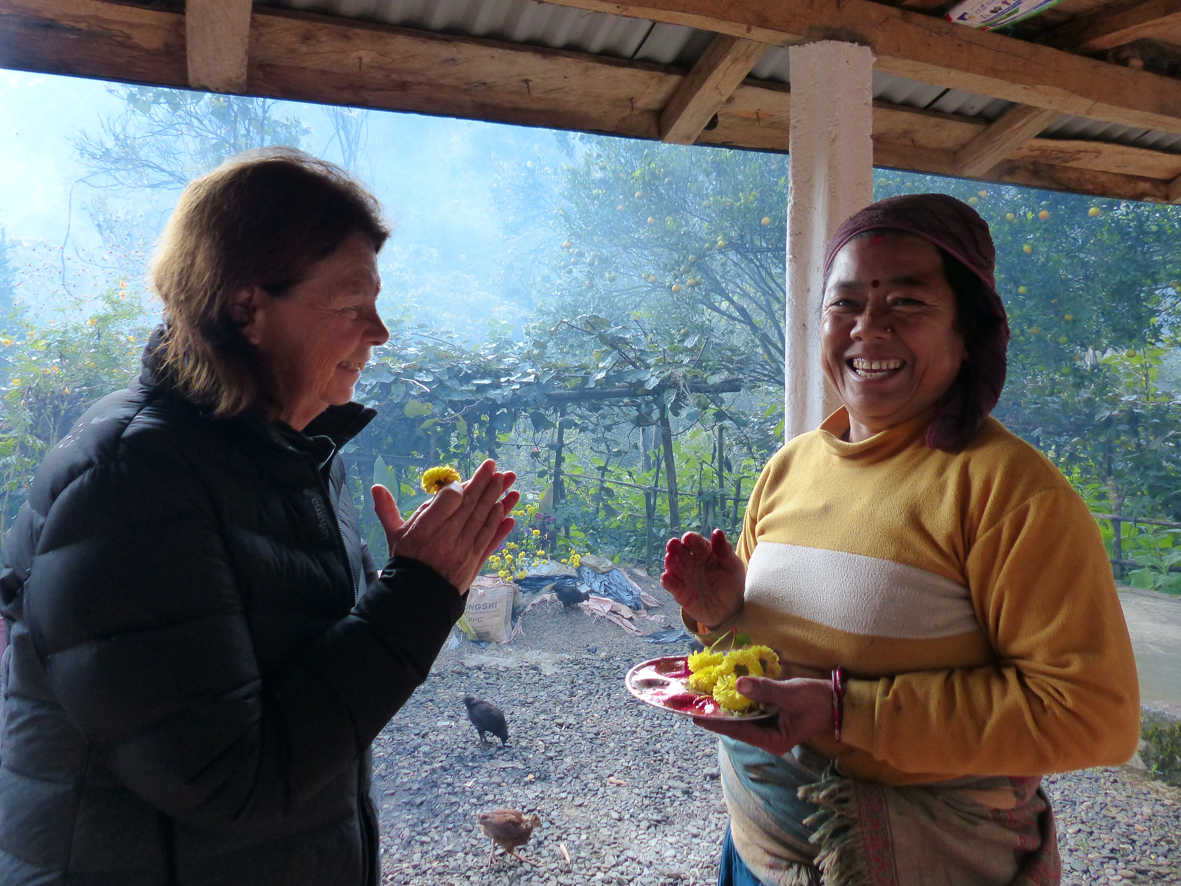 Aujourd’hui, c’est notre premier départ de Kaule, ce qui est toujours un bon moment, avec la famille qui nous accueille qui nous font des tika ( point de peinture rouge au milieu du front) et nous offre des fleurs. L’occasion également de faire une photo de la famille au complet, que nous imprimerons pour leur offrir la prochaine expédition.