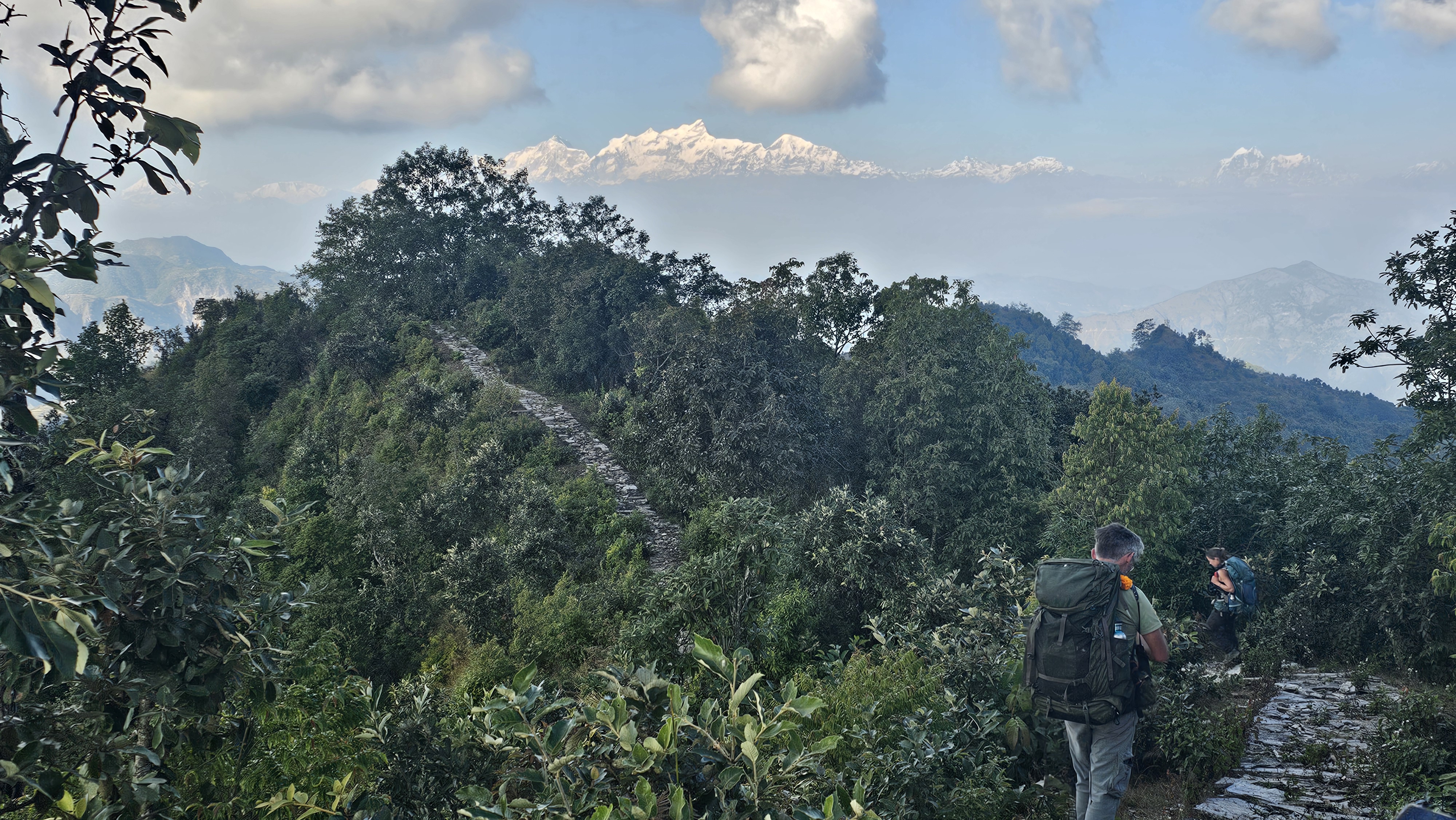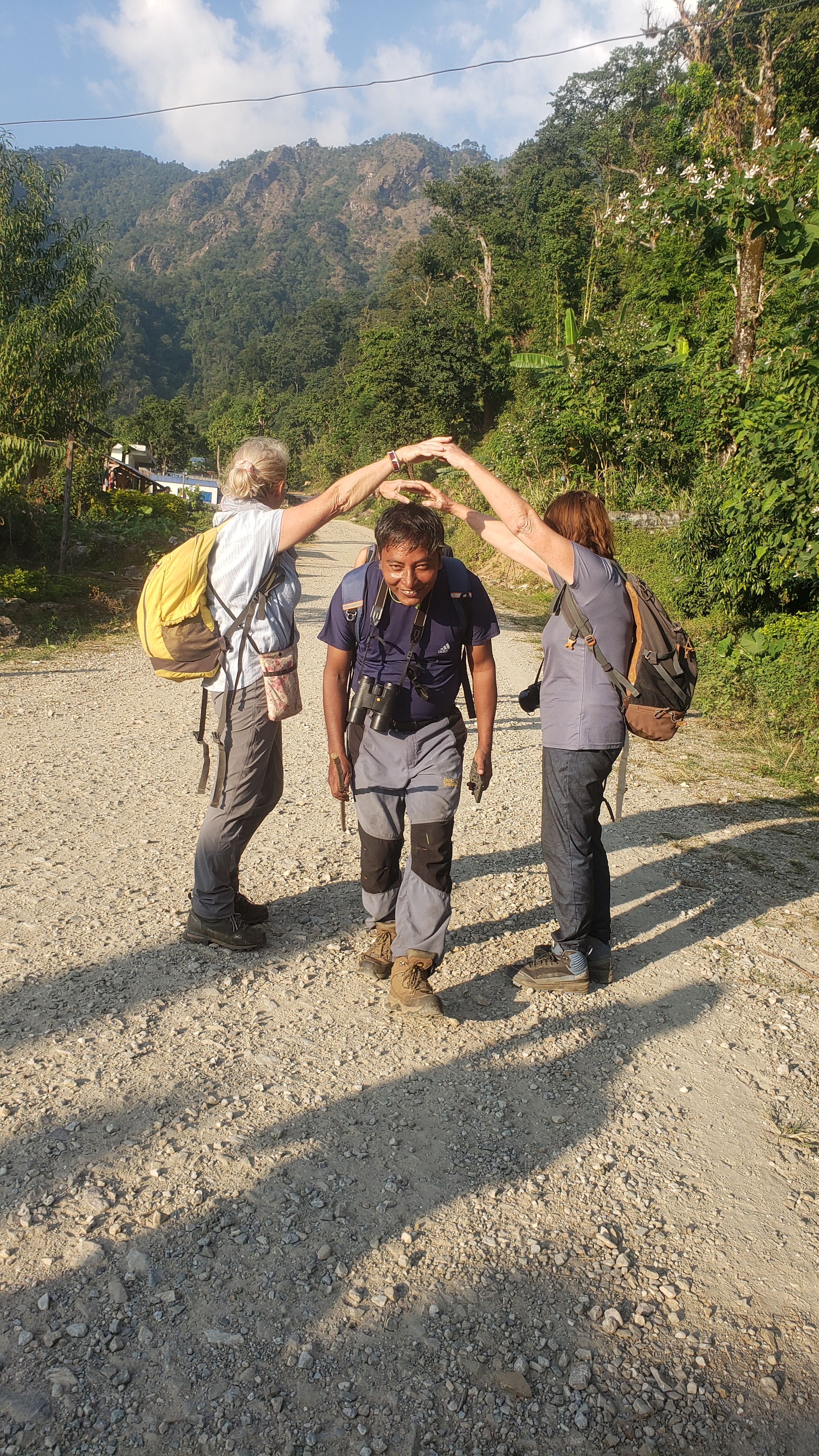 Voilà notre dernier petit déjeuner à Kaule, que l’on savoure : on a cette fois des pakodas avec un œuf dur et du kiwi. Les pakodas sont des petites galettes épaisses de pomme de terre – épices – oignons, revenues à la poële. Puis on réorganise les sacs à dos, et on fait nos aux-revoirs à la famille. De nouveau, nous recevons chacun le tika sur le front avec un petit bouquet de fleurs, en signe de bénédiction par la famille. Nous quittons le village pour prendre la direction de Gadhi. La première partie de la journée est une montée régulière, pendant laquelle nous faisons quelques pauses pour observer les oiseaux. Encore une fois, on a beaucoup de chance et nous repérons encore de nouveaux oiseaux, encore inconnus des Chepang Hills (le Pouillot de Burke, ...). Décidément, nous allons battre un record de données particulièrement intéressantes pour le projet en une seule expédition !