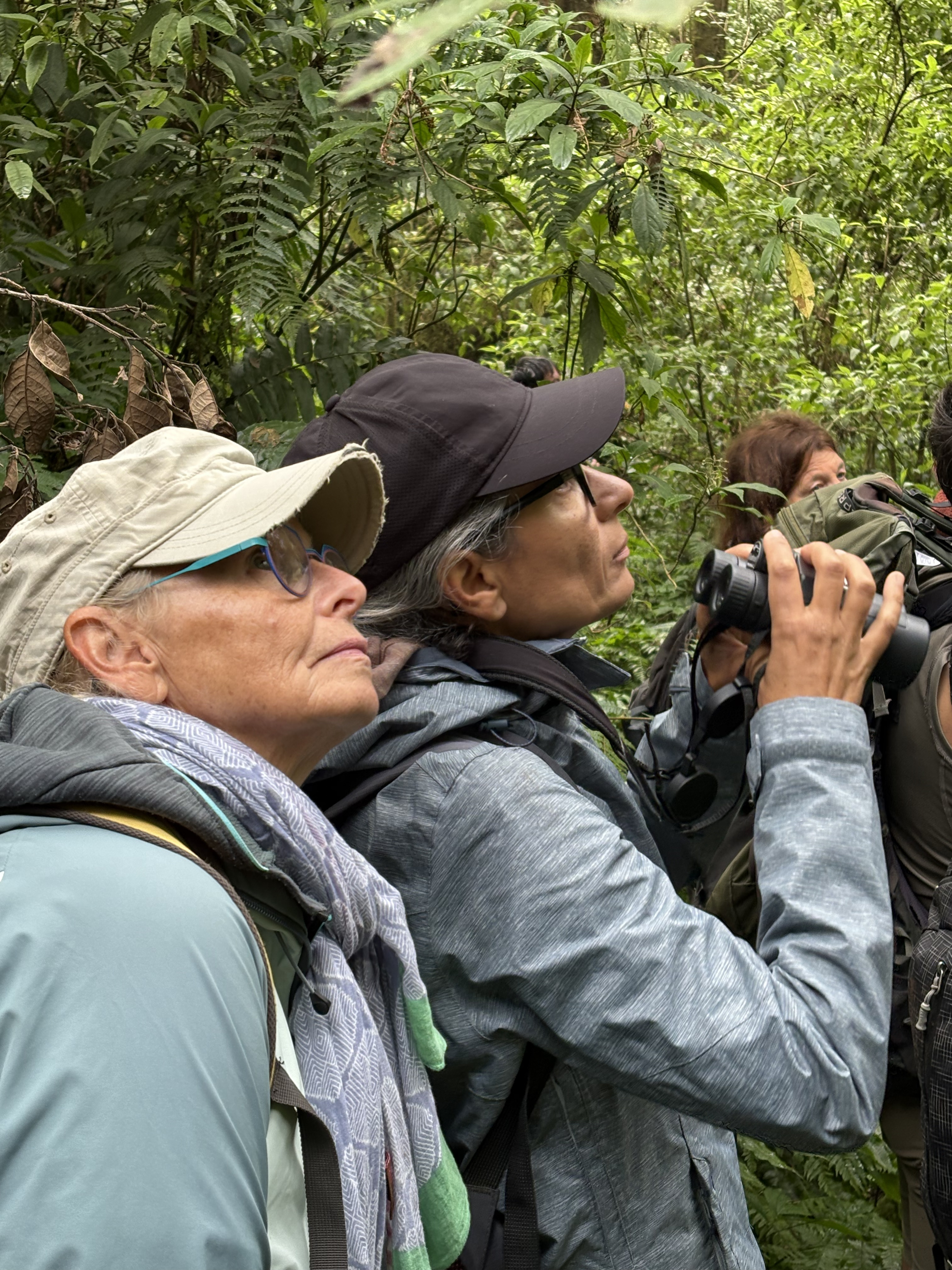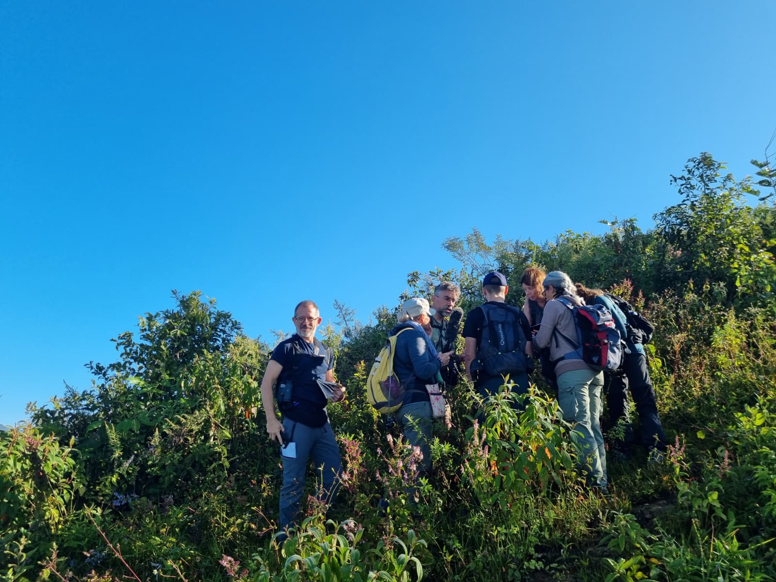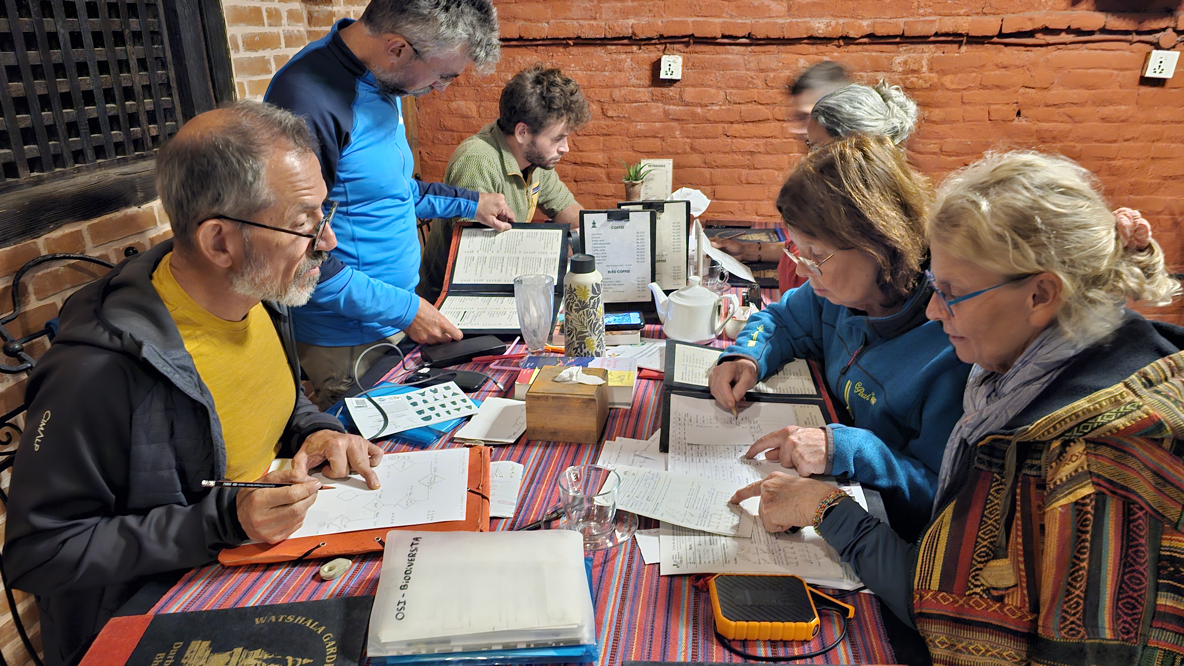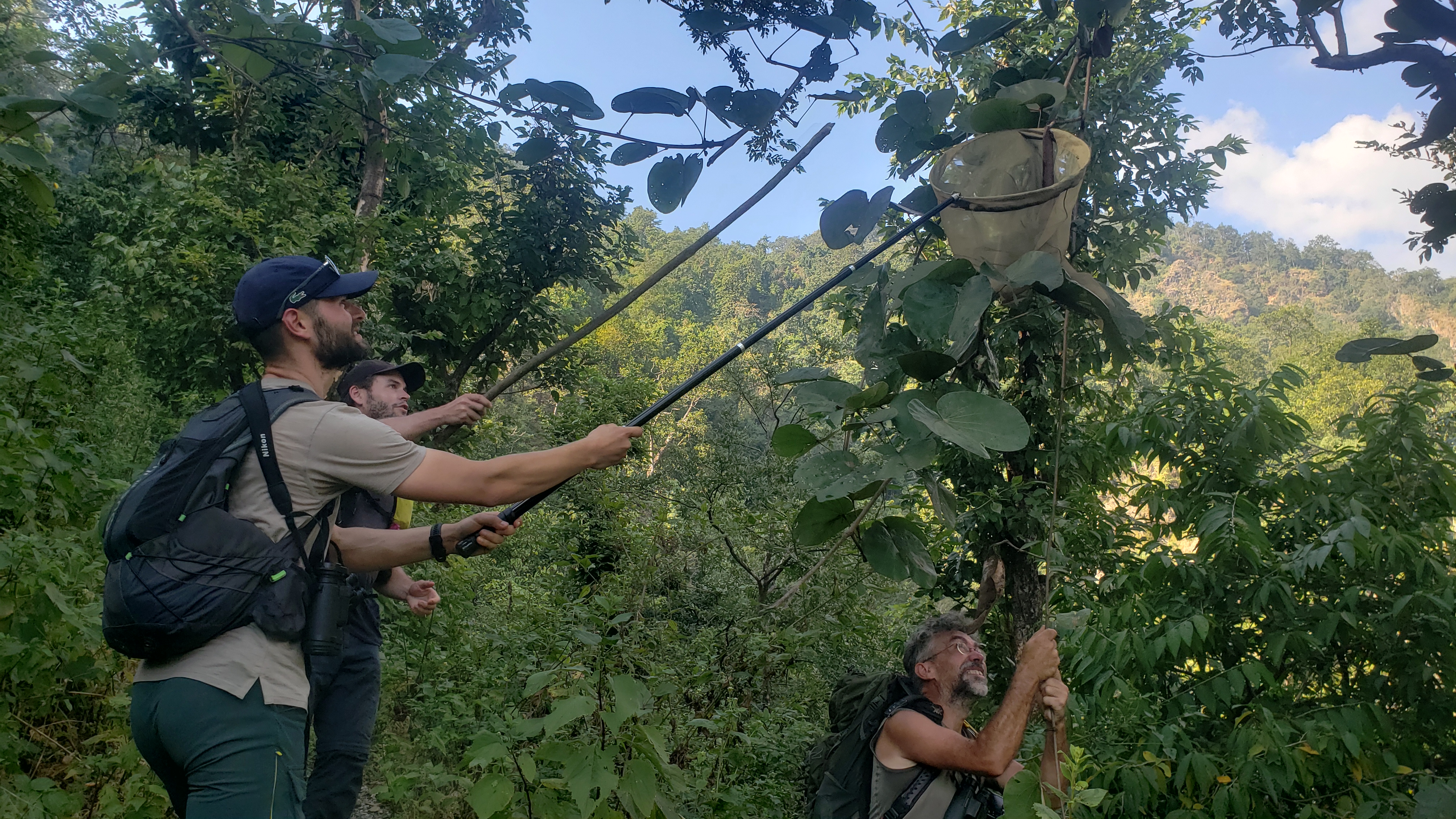 On se réveille dès 6h du matin, pour démarrer un nouveau transect, cette fois en suivant un sentier au travers de forêts et de bords de crête. Cette fois c’est Rupen, Nicolas et Catherine qui sont devant à repérer les oiseaux aux jumelles avec Alexis qui prend les photos, puis Evelyne au micro, Annie avec l’application Merlin et le bouquin des oiseaux du Népal, Sylvain à la coordination, Jean-Marc sur la prise de note papier et Brigitte sur la prise de note sur Obsmapp. On arrive à voir un Cutie du Népal, un oiseau très rare. A la fin du transect, on fait une petite pause pendant laquelle on remplit une fiche de description de l’arbre parasite « Balayo », pendant que certains attrapent quelques papillons. Sur le retour, on fait un arrêt pour réaliser un protocole habitat forestier, qui sert à estimer la qualité de la forêt, avec un score qui permet d’évaluer à quel point elle est dégradée par rapport à une forêt primaire. On obtient un très bon score de 77 %. De retour à notre camps de base, le pique-nique est très apprécié. Pendant l’après-midi, Evelyne, Sylvain, Nicolas et Catherine partent chercher un piège-photos installé par notre équipe 2 ans en arrière, tandis que le reste du groupe reste sur place pour se reposer en partie, mais ils réalisent aussi avec Rupen une interview de notre porteur Badam pour qu’il témoigne de ses observations d’animaux du coin. (Badam nous rejoint tous les jours pour nous apporter les chapatis du pique-nique, surveiller le camps quand on n’est pas là et nous ravitailler en eau de la source qui se trouve à plus de 15 minutes à pieds dans un vallon accidenté pas facile d’accès). Le soir tout le monde se met à la cuisine et on se fait une grosse poêlée de courgettes pour accompagner le riz cuisiné amené plus tôt dans la journée par Gothe, un local de Gadi. On se couche encore bien tôt, dès 21h !