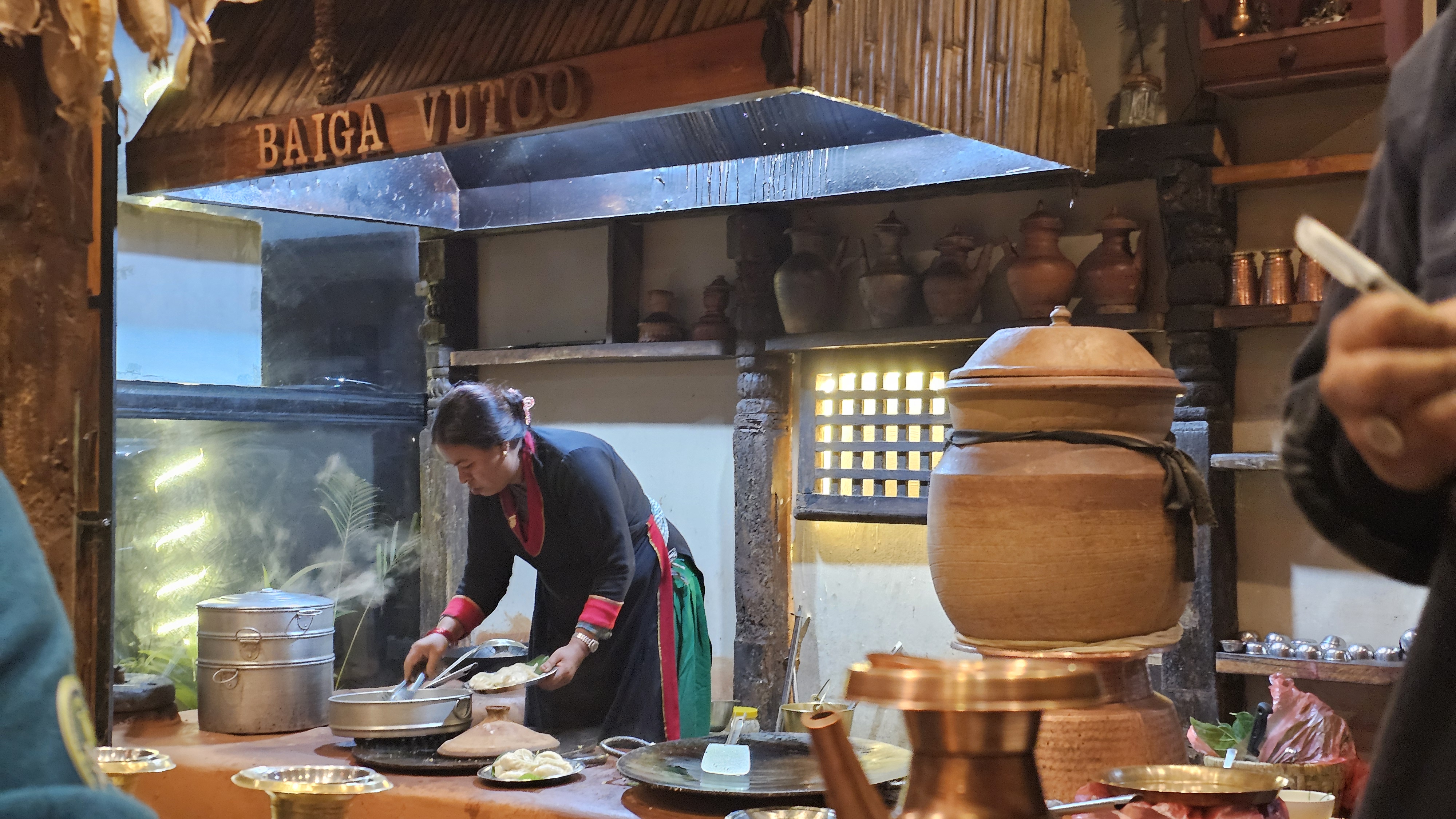 Ce soir on nous sert un dal bhat avec du dhido à la place du riz, c’est de la polenta locale. Nous avons avec une rasade d’haricots verts et patates et épinards, on est ravis et c’est le grand festin général, on en demande et on en redemande (car c’est toujours à volonté).