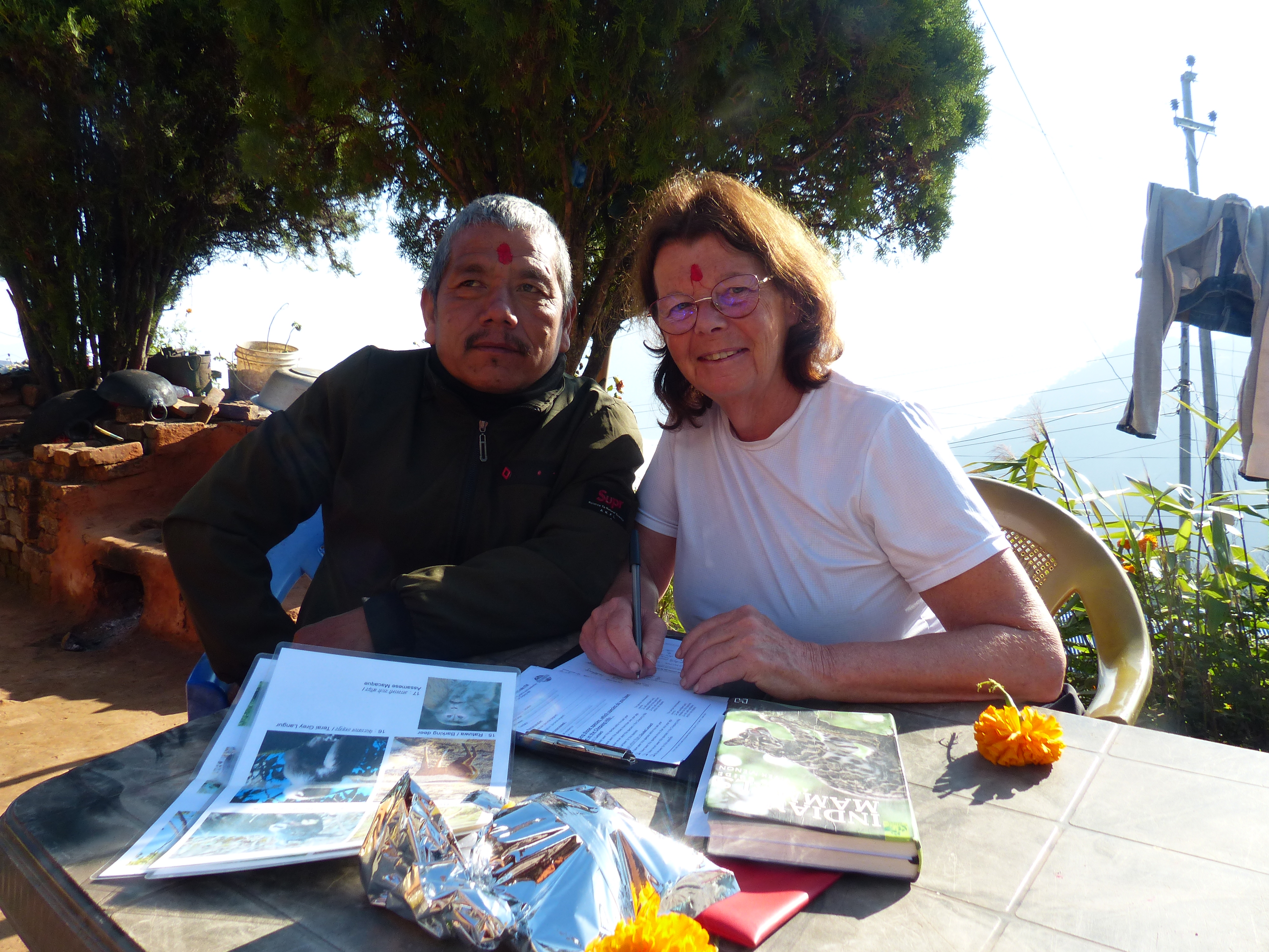 Puis nous allons tester notre tout nouveau projet d’interview systématique des habitants pour récolter des informations sur la faune locale. Rupen, Annie et Sylvain s’en vont donc interroger la dame qui semble habiter la maison la plus proche de nous avec la fiche d’information à remplir. Très vite, c’est toute la famille qui s’attroupe autour des photos qu’on leur montre et tout notre groupe qui vient profiter de ce bel instant de vie et de lien avec les locaux. Les photos les rendent très bavards et Rupen nous fait la traduction. On apprend ainsi la présence régulière de 4 Gaurs (les plus gros bovidés du monde, jusqu’à 2mètres et plus de hauteur au garrot !) dans leur village ! Après cette belle discussion, la famille nous offre des toutes petites châtaignes récoltées et grillées pour nous. Puis Rupen nous montre comment le maïs est laissé séché au plafond, puis écrasé sous une meule (on s’y essaye pour voir ce que ça donne). Nous repartons en cheminant tranquillement en faisant une belle boucle avant de revenir au village de Gadhi vers 16h30. La soirée se passe tranquillement en temps libre – boissons chaudes sur la terrasse – douches etc en attendant le dal bhat du soir.