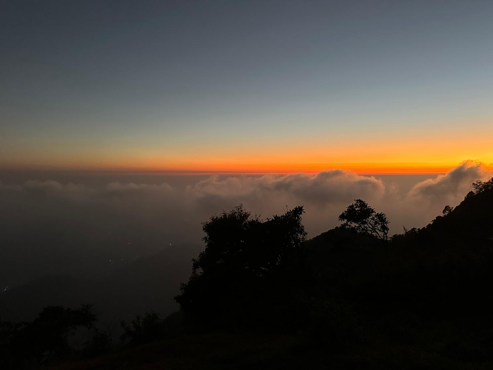 On se retrouve ensuite sur notre camps de base des premiers jours à Chisapani, pour se régaler du pique-nique : de nouveau des sel rotis, avec une chayotte bouillie, de l’avocat, un œuf dur, plein d’oranges...Pendant que certains se reposent, d’autres vont chercher les 2 piège-photos non loin du campement. On se remet ensuite en route pour entamer la descente finale. Nous avons pour objectif de trouver l’arbre qui fait des branches pleines de glands denses serrés les uns contre les autres, et que l’on avait repérés à la montée par terre. Sans problème, nous le trouvons. C’est l’occasion de remplir une nouvelle fiche de description, et aussi un bon moment de rigolade que l’on nommera la « oak war » car ces glands sont super légers et donc des projectiles idéaux ! On fait aussi de nouveau un protocole habitat forestier, et on finit la randonnée juste au moment du coucher de soleil magnifique sur Gadhi,et toujours les sublimes montagnes de l’Himalaya en arrière plan.