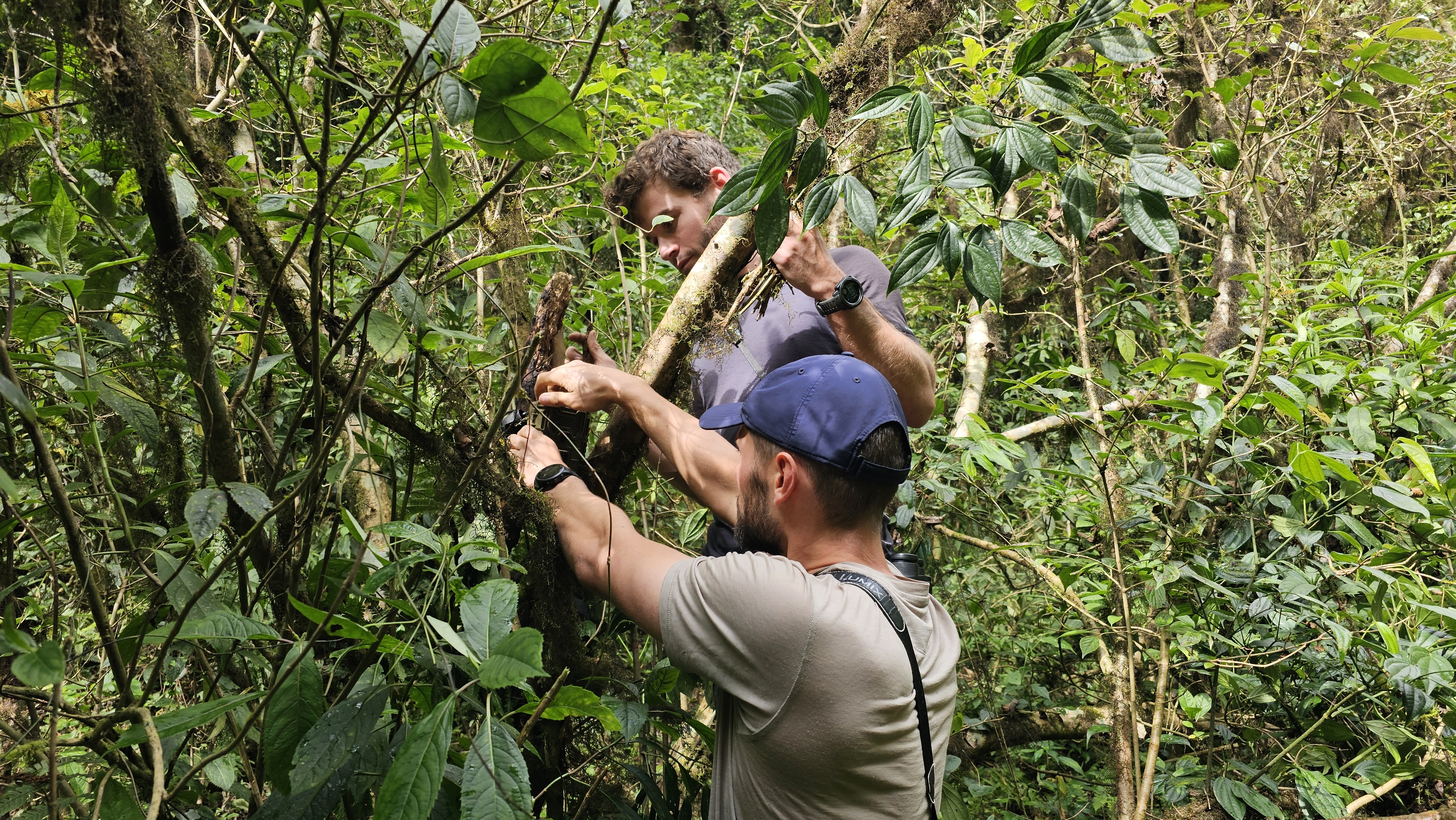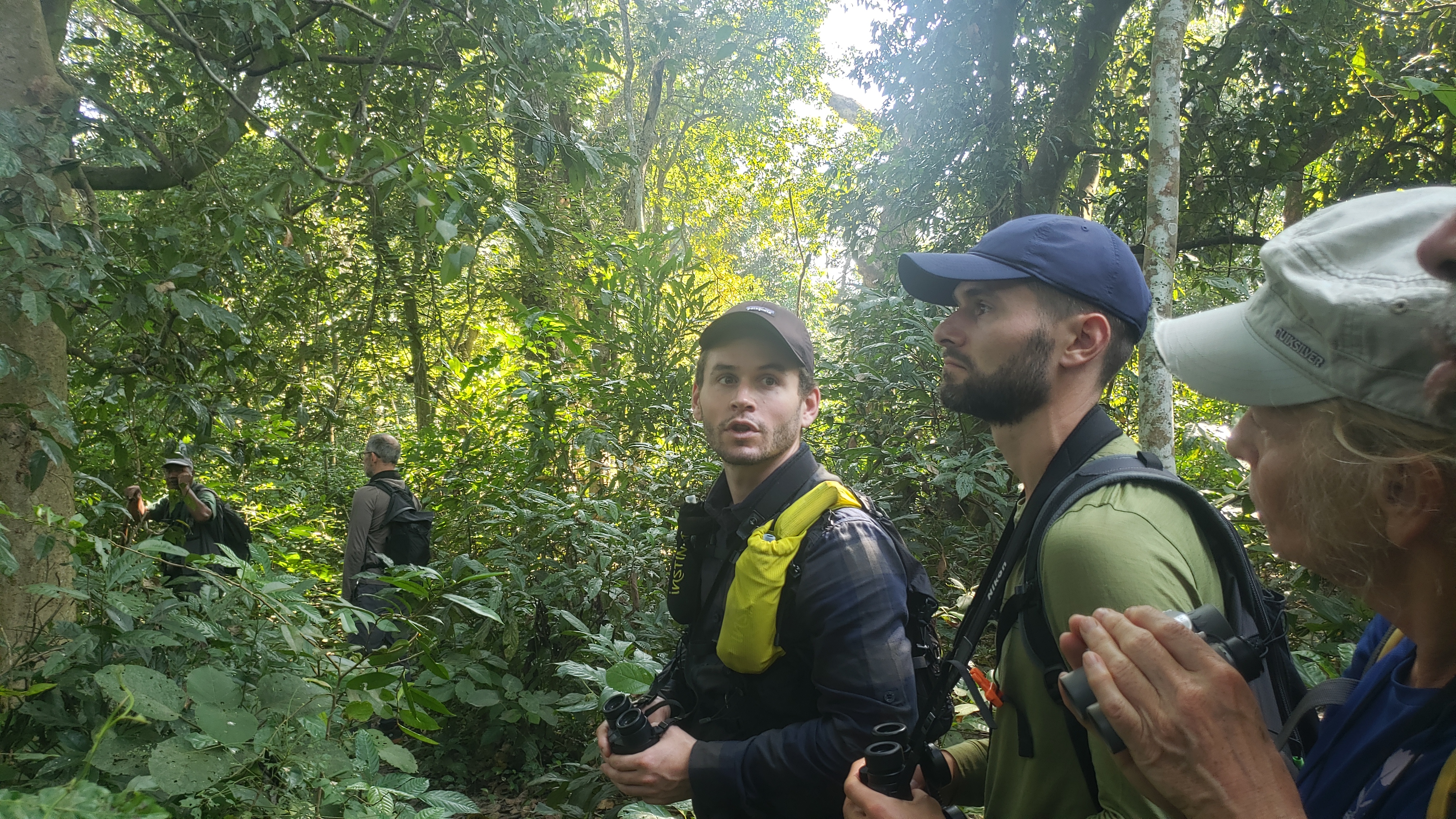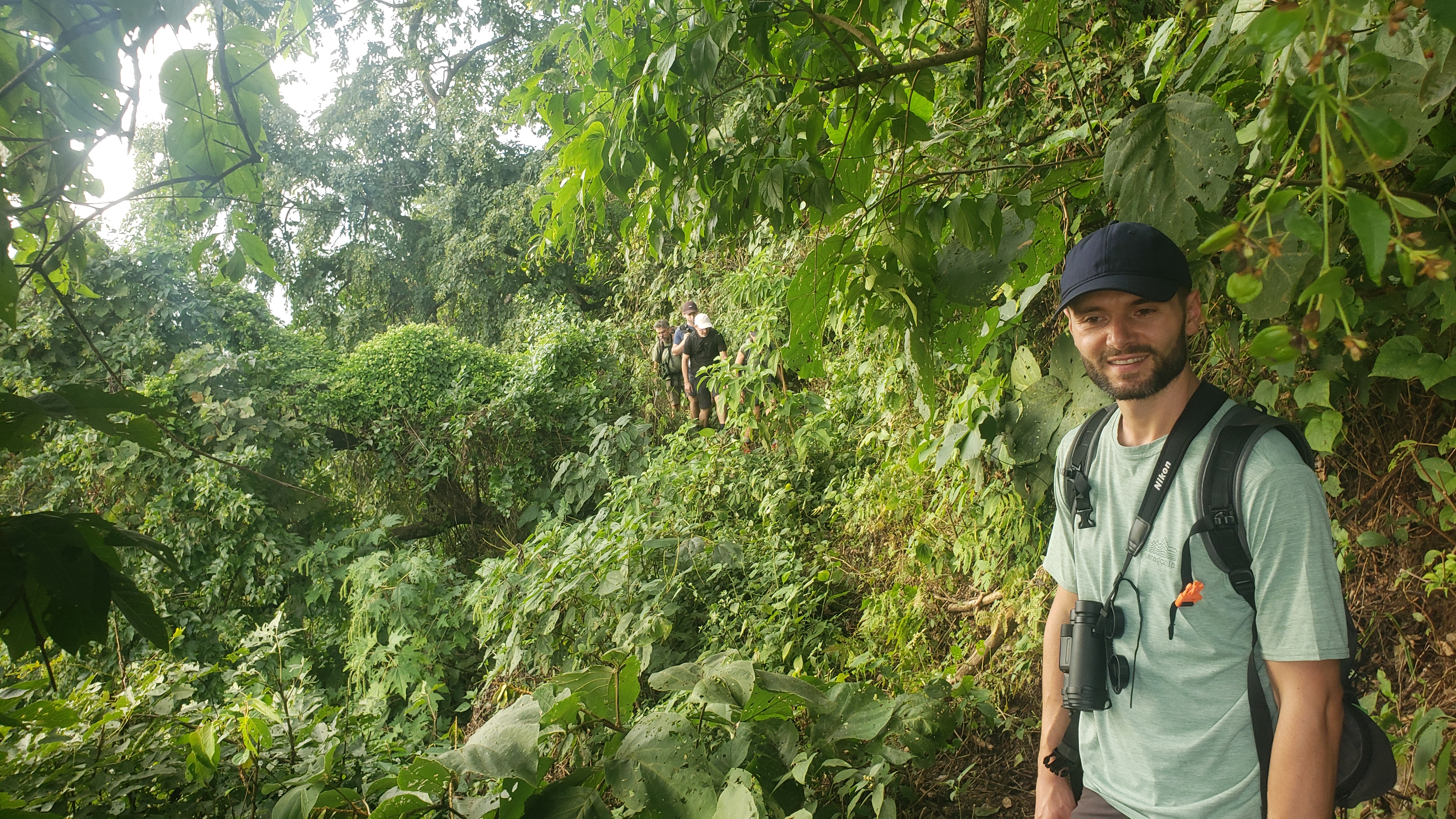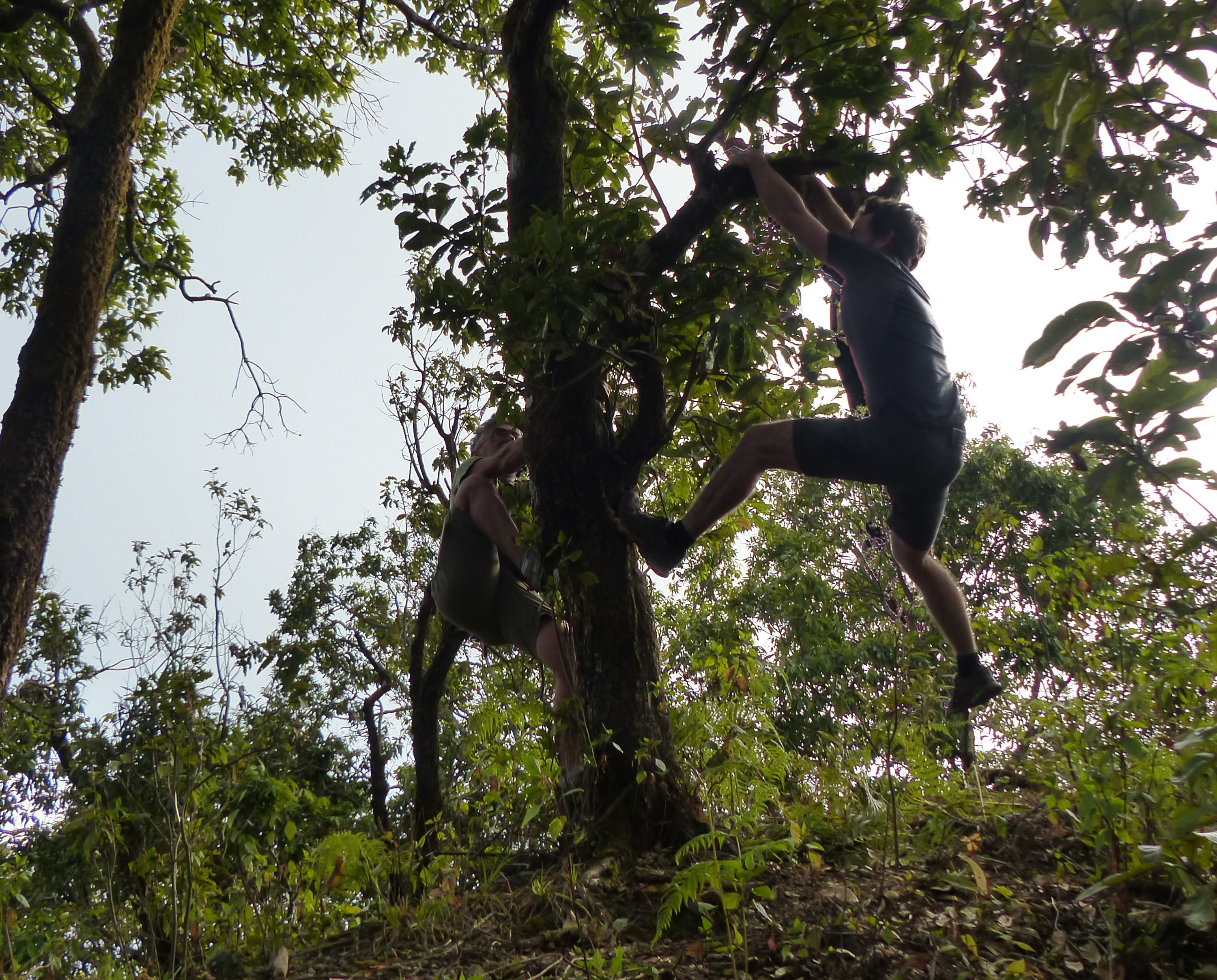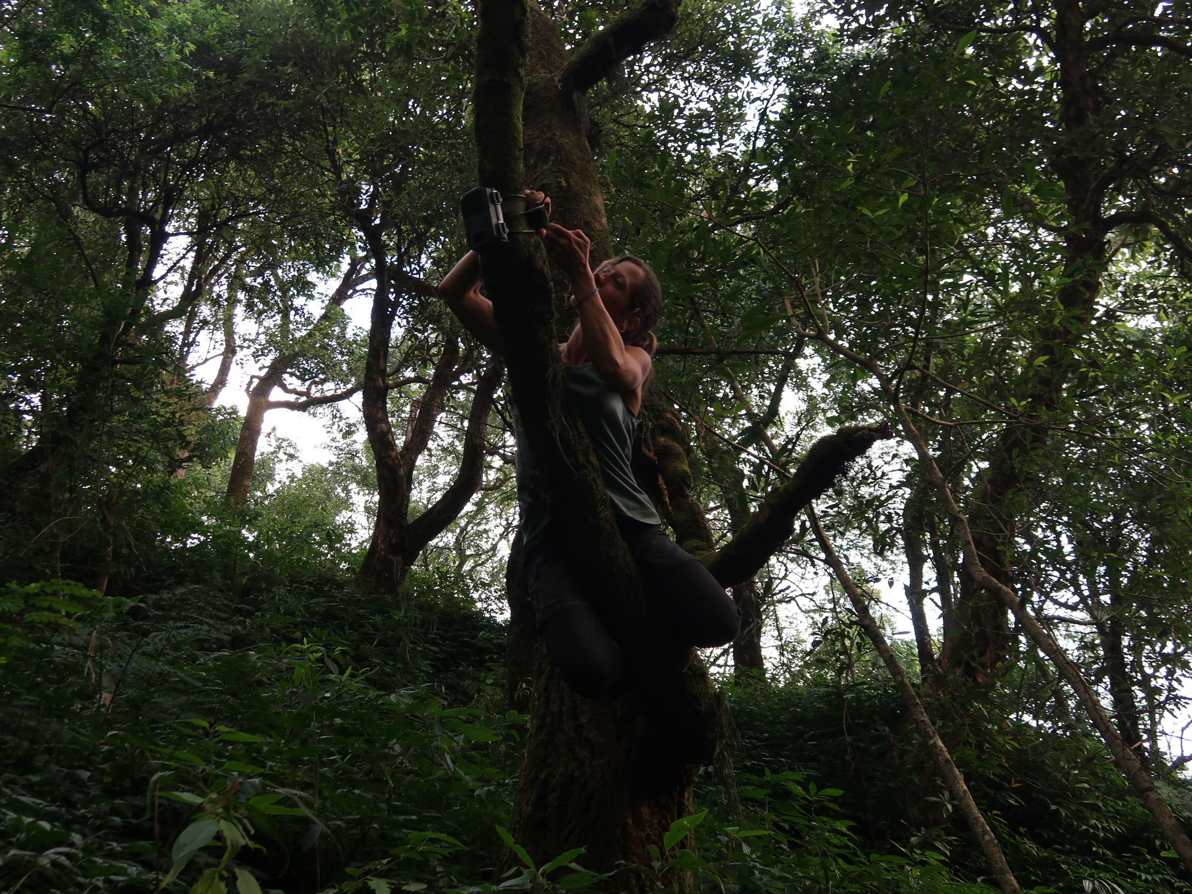 On se lève avec le soleil et une superbe vue. Nous partons faire le transect dans le vallon sauvage de Chisapani, cette fois en changeant les rôles. Ce vallon est au coeur de notre projet puisqu’il abrite le Garrulaxe à ailes rouges, un oiseau que l’on pensait totalement disparu du Népal depuis plus de 70 ans, avant de se rendre compte qu’il en existait encore une petite population juste là, dans ce coin de forêt préservé. L’ambiance de ce vallon est incroyable, on a l’impression de pénétrer dans une forêt primaire authentique, avec des effets de rayons lumineux qui jouent dans les feuillages luxuriants, et des chants et cris d’oiseaux partout. On remarque plusieurs écureuils dans les hauteurs, ainsi que plusieurs Langhurs du Teraï. On voit des multitudes de Barbus géants, de grands oiseaux au plumage vert et bleu. Arrivés en bas du transect, on prend le temps de caractériser une fougère arborescente avec une clé d’identification imprimée et on la prend en photo dans tous les sens. On espère pouvoir ainsi identifier l’espèce à coup sûr, en faisant valider par les chercheurs spécialisés en fougères arborescentes. Au Népal, toute donnée de fougère arborescente est précieuse pour les avancées des recherches car elles sont rares. Puis on remonte le vallon tout en récupérant en chemin les enregistreurs audio automatiques qui avaient stratégiquement été placés à 3 endroits différents lors de l’expédition précédente (il y a donc 2 ans). Ces enregistreurs servent à compléter nos données de présence des oiseaux dans ce vallon, après analyse des chants et cris enregistrés. Petite déception, l’un des 3 enregistreurs a disparu. Nous retrouvons sur le tronc qui le portait des coups de hache, qui témoignent qu’un local a du tomber dessus et le retirer, ne sachant pas ce que c’est…