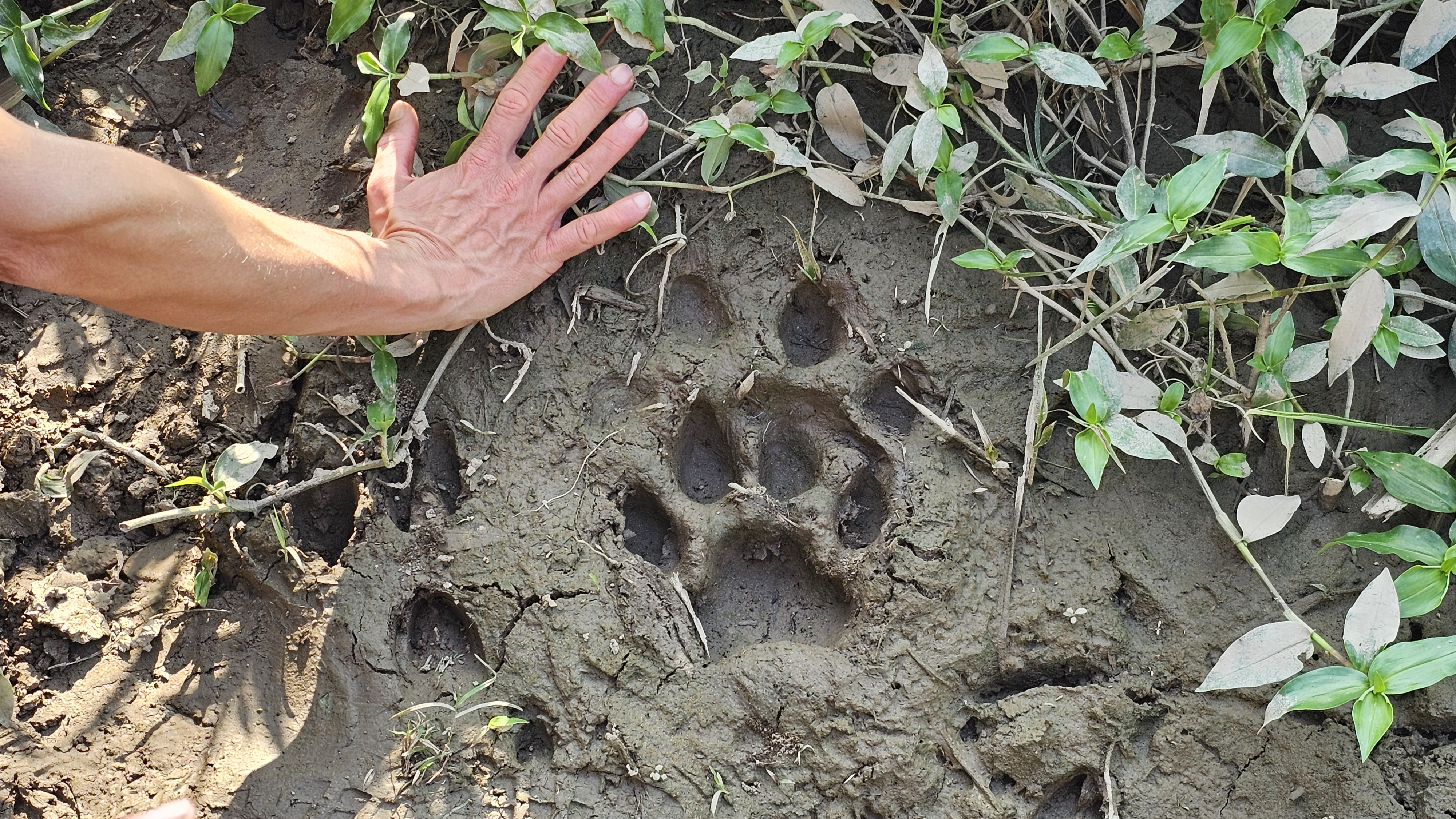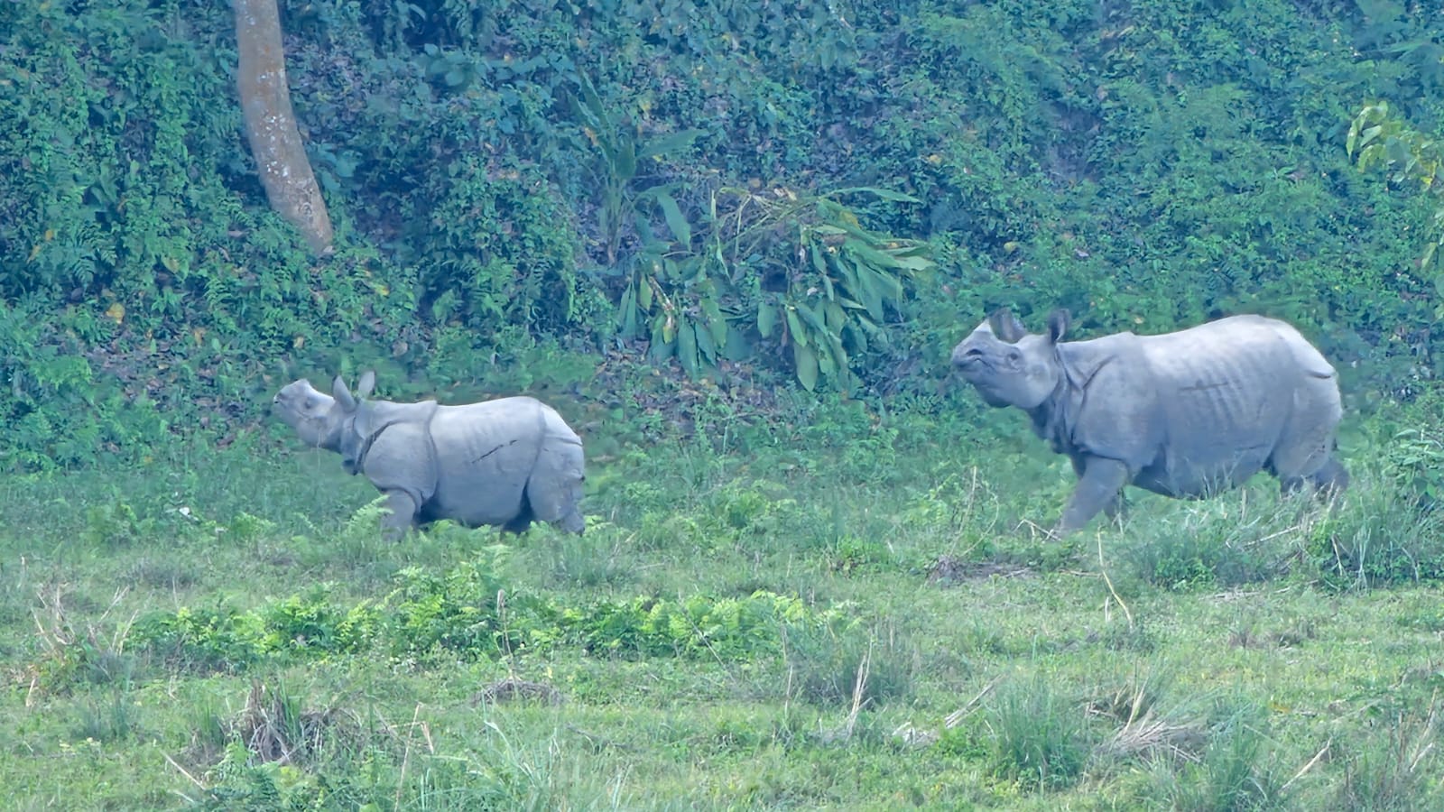 Après le pique-nique, plusieurs paons bleus et une magnifique empreinte de tigre dans la boue (et autres belles empreintes d’éléphant sauvage, rhinocéros et cerfs), nous voilà à longer le bord des rives du Rapti en espérant y voir un Rhinocéros. Après une bonne demi-heure d’attente, on se résigne à rentrer. Mais Nicolas et Jean-Marc perçoivent des herbes bouger depuis notre promontoire. C’est sûr il y a quelque chose de gros là-dessous. On attend encore ...mais rien ne vient. On repart et là, Eveline et Jean-Marc qui restaient en retrait nous font de grands signes excités ! Ils sont là, un rhinocéros et son bébé en train de courir avant de disparaître dans la forêt.