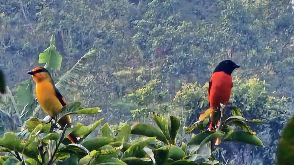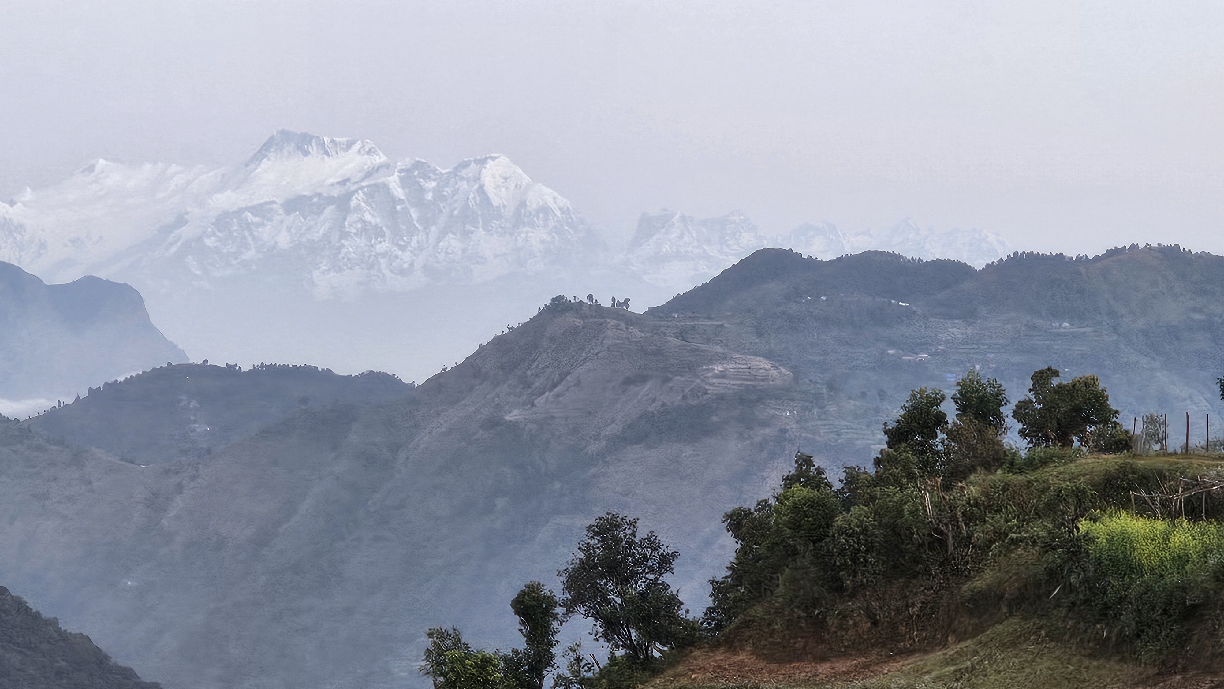 Après un dernier petit déjeuner bien agréable dans le jardin du Chitwan Gaida Lodge, nous embarquons sur la jeep avec tous nos bagages, direction les Chepang Hills. On s’arrête en chemin pour des courses de fruits et légumes sur les étalages de bord de route et Rupen, notre guide local nous rejoint. On arrive en bas du chemin de rando vers 10h30. Nous allons pouvoir randonner légers car c’est la jeep qui amène nos affaires jusqu’au village de Gadhi. La première montée raide en plein soleil est un peu dure mais on est bien récompensés par le pique-nique à l’ombre pendant lequel nous guettons l’écureuil noir géant (mais nous ne le voyons pas). La suite de la randonnée nous enchante de belles vues, de la découverte des premières maisons et installations Chepang, et de quelques oiseaux évidemment. Avant la dernière grosse montée, Annie choisit de finir par la route avec Rupen pour éviter les passages trop raides pendant que le reste du groupe finit par le petit sentier. On voit 8 Langhurs sauter de branches en branches. Et la rando se finit avec une magnifique vue sur les Annapurnas et le soleil couchant. Après nos premières « douches » froides on se régale d’un bon dal bhat. Et c’est autour d’une boisson chaude que Sylvain et Catherine nous expliquent le protocole oiseaux que l’on va réaliser demain, puis qu’on se répartit les rôles.
