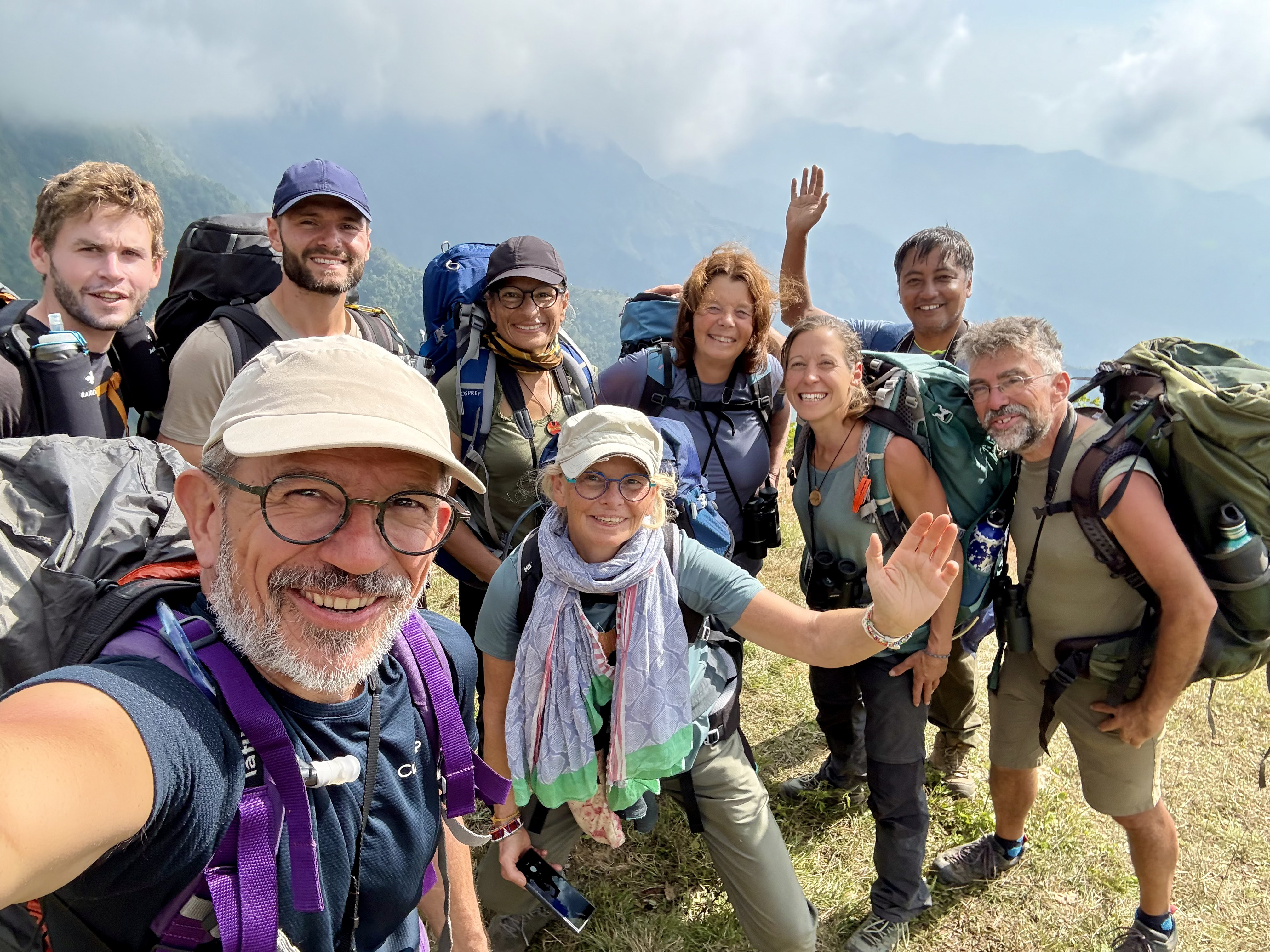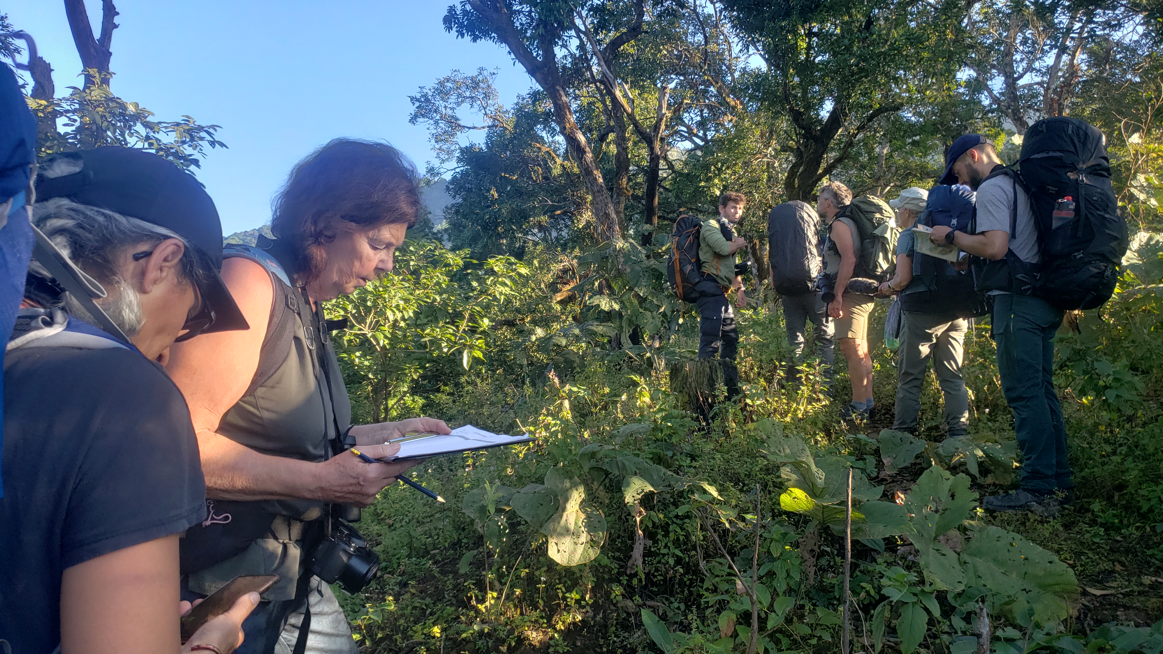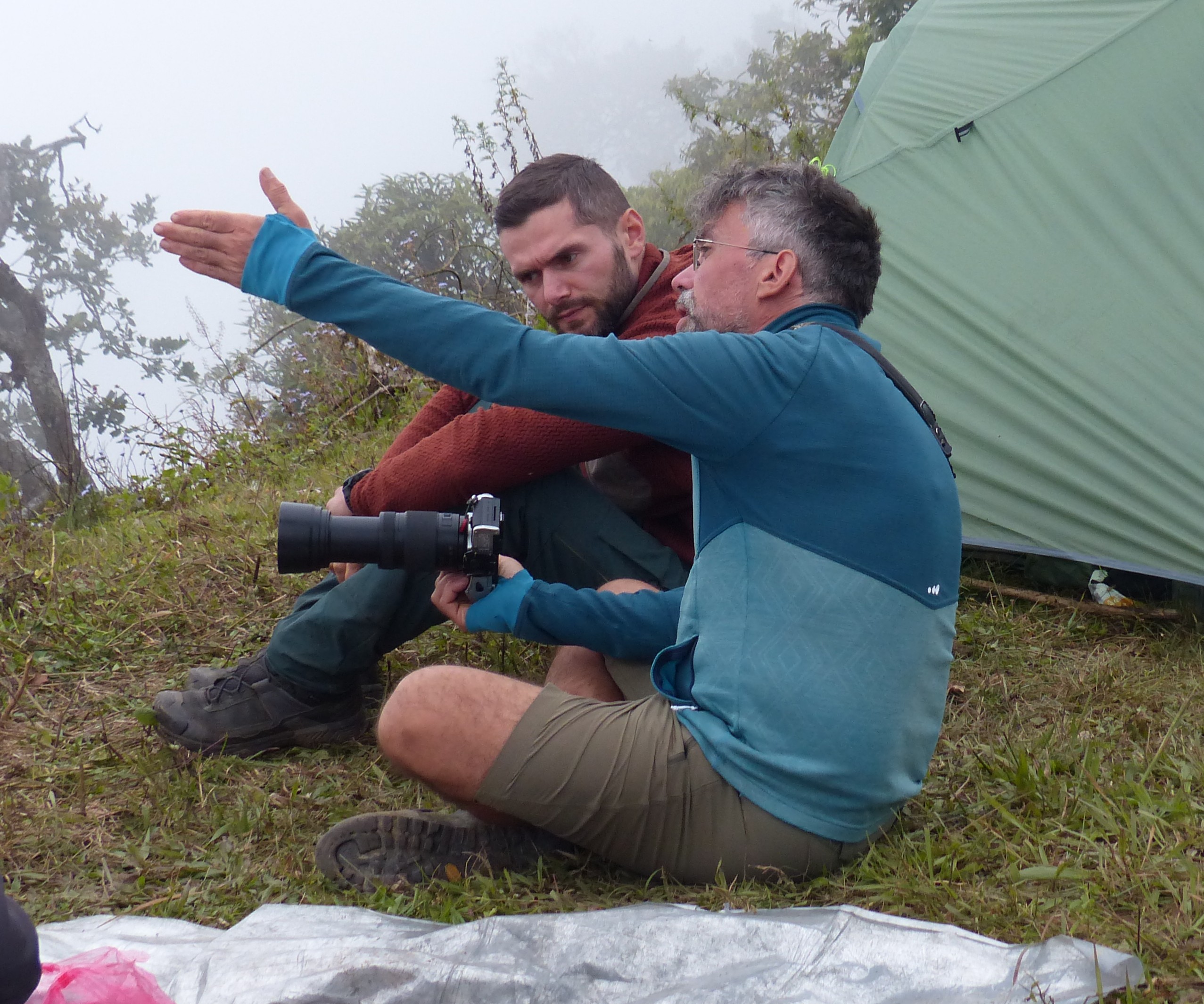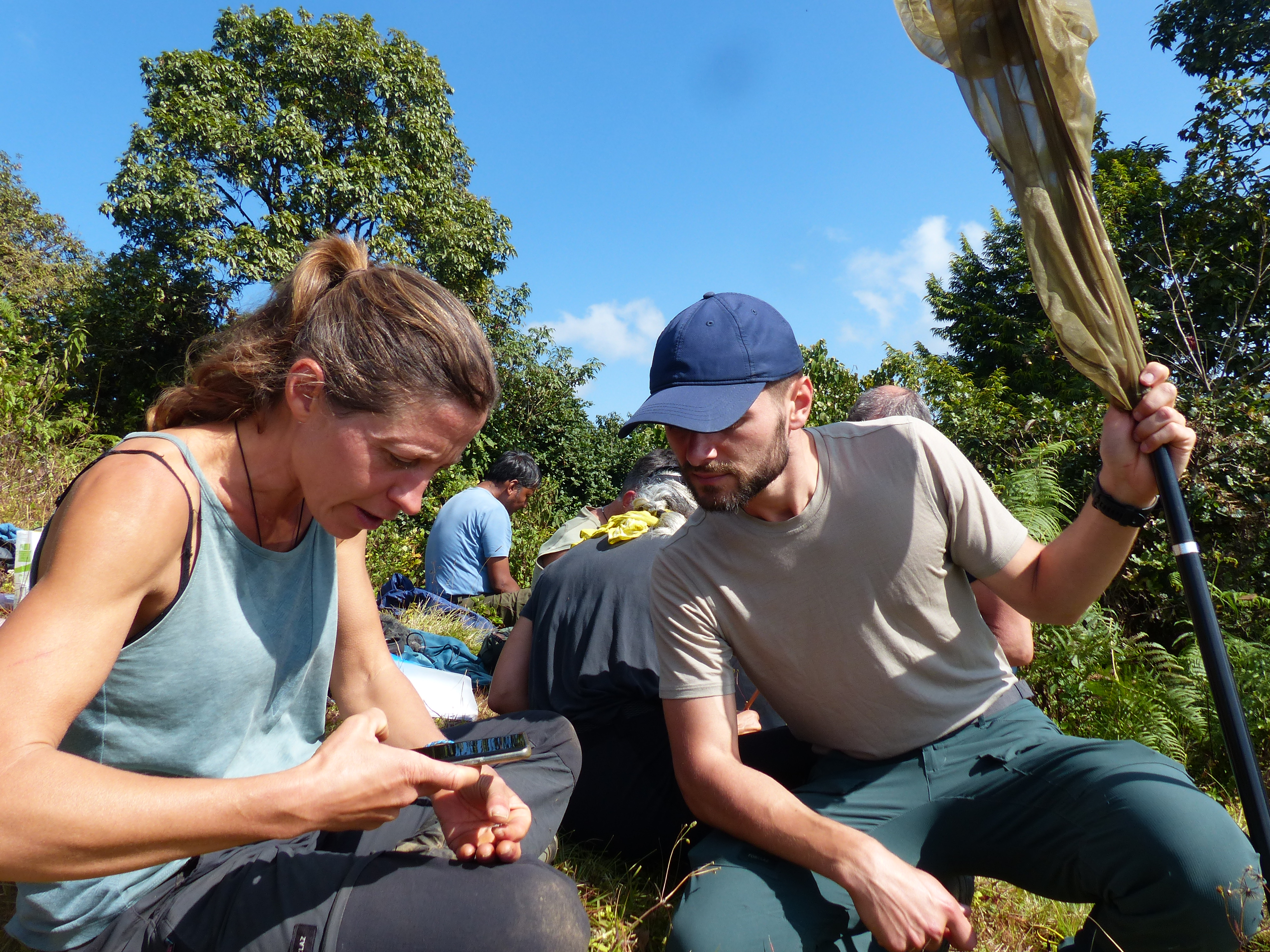On se réveille dès 6h du matin, pour démarrer un nouveau transect, cette fois en suivant un sentier au travers de forêts et de bords de crête. Cette fois c’est Rupen, Nicolas et Catherine qui sont devant à repérer les oiseaux aux jumelles avec Alexis qui prend les photos, puis Evelyne au micro, Annie avec l’application Merlin et le bouquin des oiseaux du Népal, Sylvain à la coordination, Jean-Marc sur la prise de note papier et Brigitte sur la prise de note sur Obsmapp. On arrive à voir un Cutie du Népal, un oiseau très rare. A la fin du transect, on fait une petite pause pendant laquelle on remplit une fiche de description de l’arbre parasite « Balayo », pendant que certains attrapent quelques papillons. Sur le retour, on fait un arrêt pour réaliser un protocole habitat forestier, qui sert à estimer la qualité de la forêt, avec un score qui permet d’évaluer à quel point elle est dégradée par rapport à une forêt primaire. On obtient un très bon score de 77 %. De retour à notre camps de base, le pique-nique est très apprécié. Pendant l’après-midi, Evelyne, Sylvain, Nicolas et Catherine partent chercher un piège-photos installé par notre équipe 2 ans en arrière, tandis que le reste du groupe reste sur place pour se reposer en partie, mais ils réalisent aussi avec Rupen une interview de notre porteur Badam pour qu’il témoigne de ses observations d’animaux du coin. (Badam nous rejoint tous les jours pour nous apporter les chapatis du pique-nique, surveiller le camps quand on n’est pas là et nous ravitailler en eau de la source qui se trouve à plus de 15 minutes à pieds dans un vallon accidenté pas facile d’accès). Le soir tout le monde se met à la cuisine et on se fait une grosse poêlée de courgettes pour accompagner le riz cuisiné amené plus tôt dans la journée par Gothe, un local de Gadi. On se couche encore bien tôt, dès 21h !