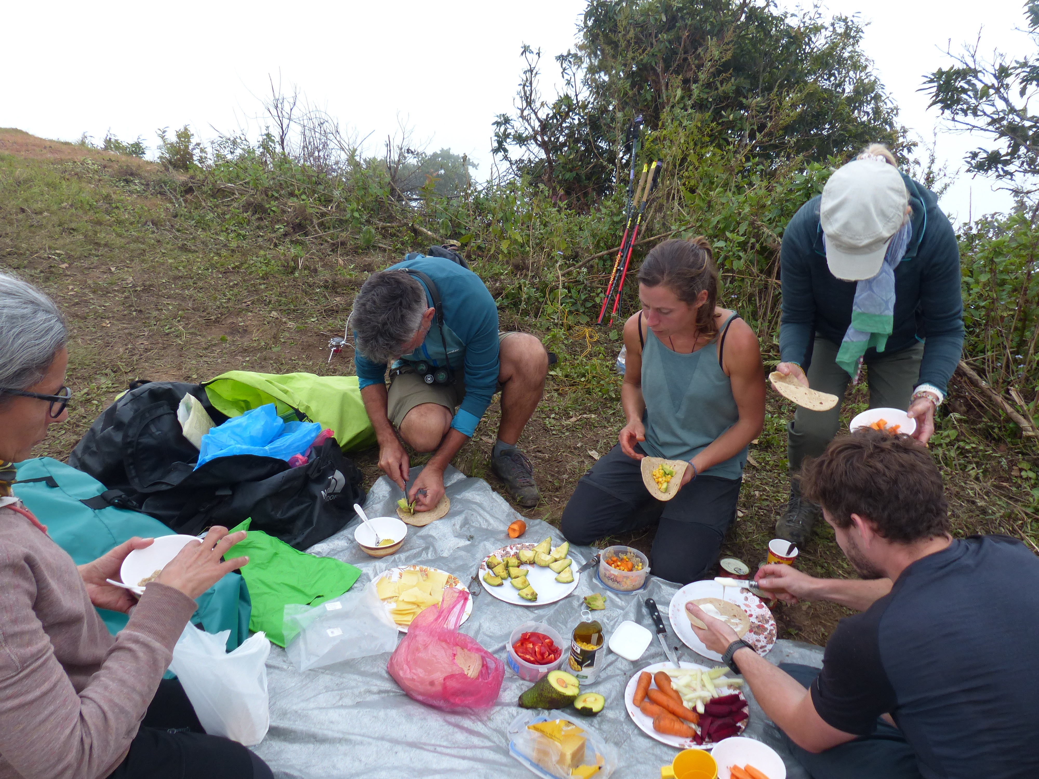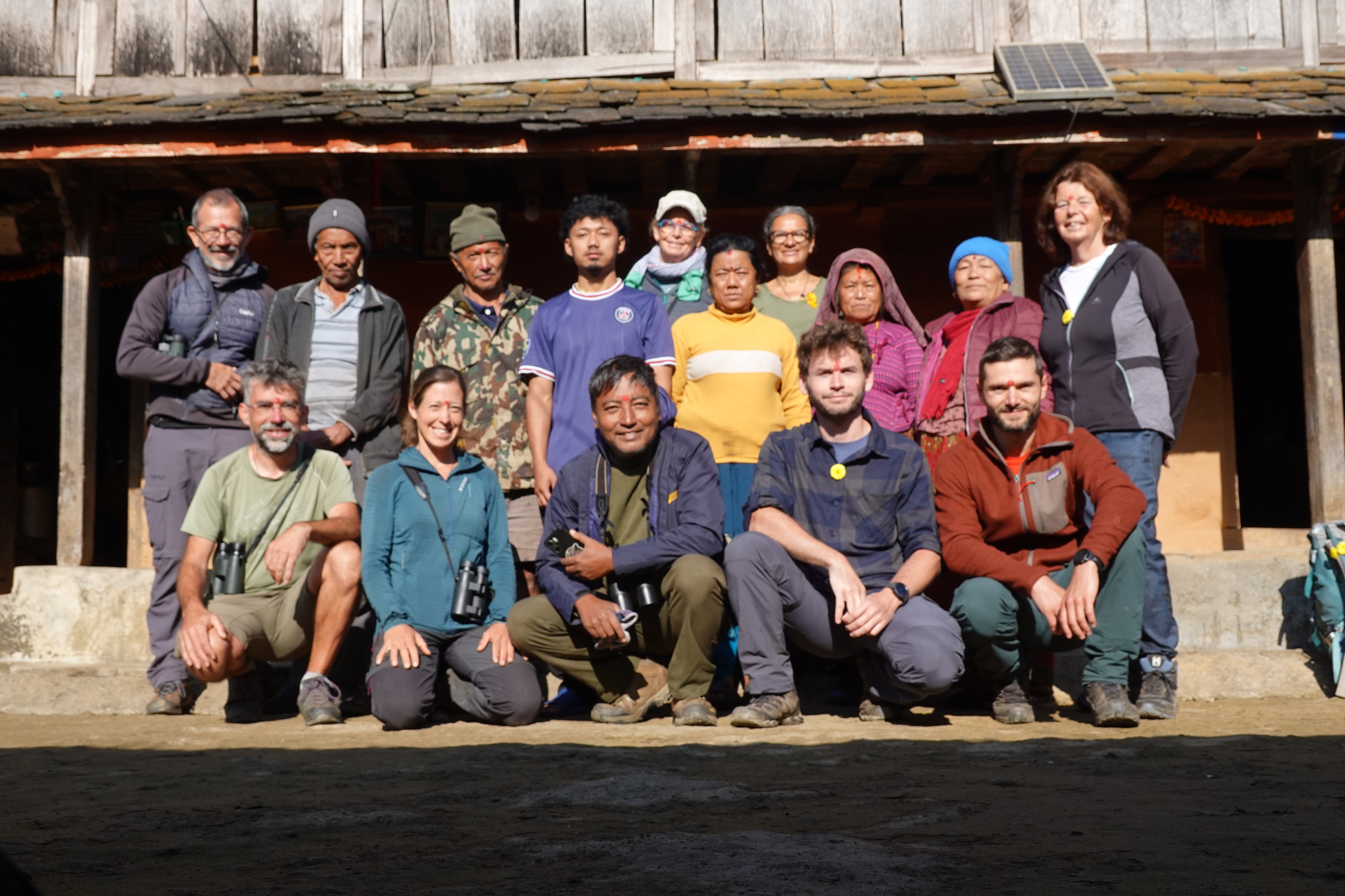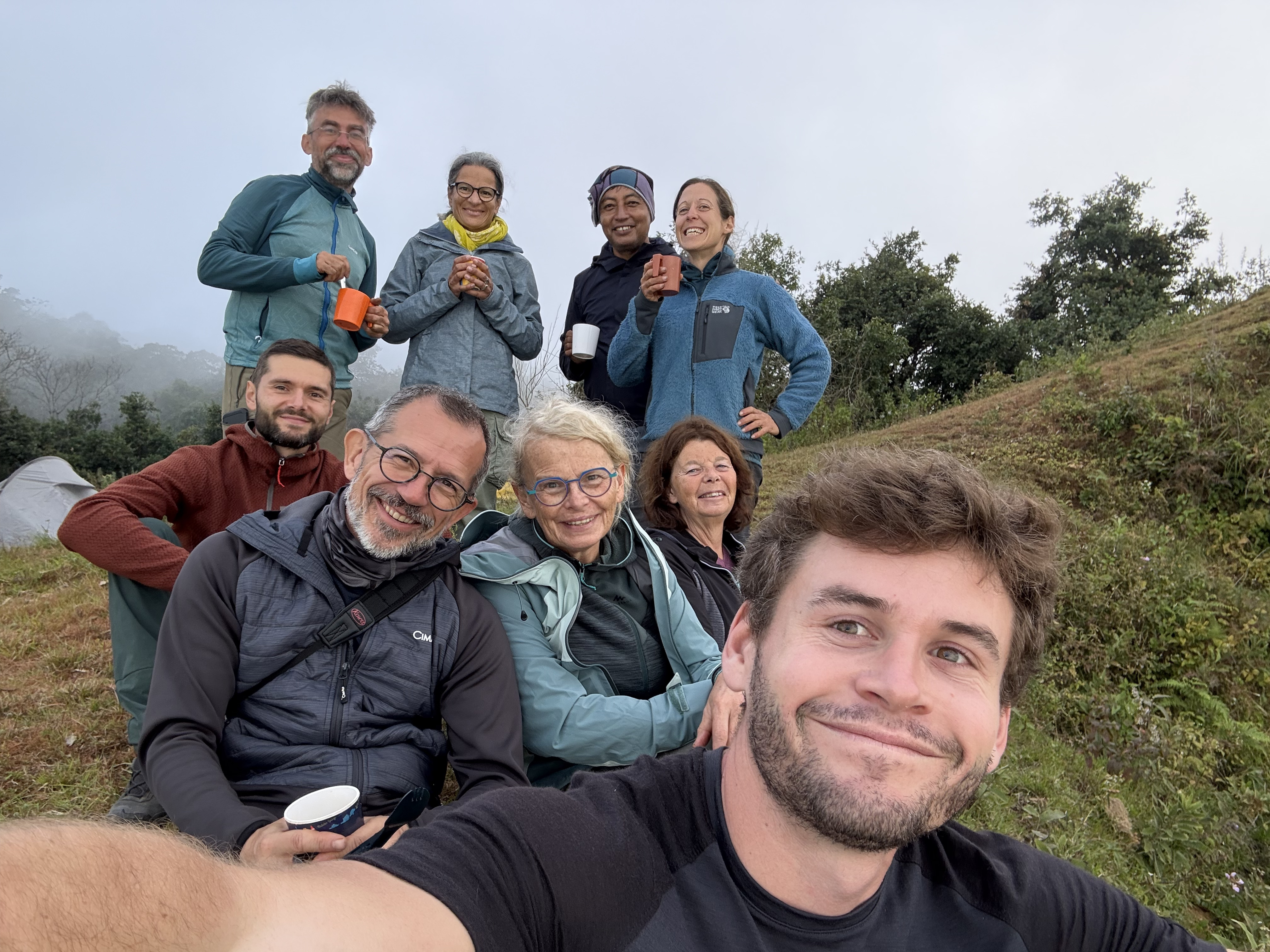 Ce matin on se réveille tranquillement avec le soleil, et le petit déjeuner prend des allures de festins avec les grenades préparées la veille qui subliment le mélange de porridge d’avoine au miel, muesli croustillant, graines de chia, noix et bananes. Le tout sur notre point de vue de bord de crête dont on ne se lasse pas. Puis on range le campement, et on termine la matinée par des petits temps de synthèse botanique, et la vérification de nos 2 premiers pièges-photos installés. En chemin pour vérifier le second, on a le plaisir de bien voir 5 à 6 Langurs du Teraï . Un dernier pique-nique et on quitte notre chouette camps de base, après quelques selfies de groupe pour le souvenir. La marche pour le prochain village se fait tranquillement, avec une pause pour caractériser l’habitat forestier de nouveau (cette fois le score est de 32 %, ce qui représente bien l’influence de la grosse piste et des activités humaines dans ce passage). On finit notre randonnée par une grande descente qui nous amène au village de Kaule, où nous sommes accueillis chez une famille avec des oranges cueillis dans leur jardin et du thé, lui aussi, cultivé dans le champs d’à côté. Kaule est un village incroyable, quasi auto-suffisant. On s’y promène de maison en maison, toutes très proches les unes des autres et séparées par de tout petits sentiers de terre, avec partout des fruits et légumes qui poussent en plein milieu du passage, ainsi que des poules, des chèvres, des buffles...et les habitants qui vivent sur leurs terrasses et nous accueillent avec de grands sourires. Après le thé, on s’installe et on a tout juste le temps de prendre une douche (au sceau et à l’eau froide) bien méritée et pour certains le temps de faire un peu de lessive avant l’heure du dal bhat. On a même la chance de goûter des « barela » !Effectivement, dans la descente vers Kaule, une dame s’est empressée d’offrir ces légumes à Jean-Marc qui les regardait curieusement. On les a donc donné à la famille qui nous les a cuisinés. Après un bon thé, chacun se prépare à dormir. Alors qu’il n’y avait plus que Annie, Sylvain et Catherine à table, Rupen leur fait remarquer qu’il y a une séance de shaman en cours car on entend les percussions au loin. De façon complètement improvisée, il les emmène voir la cérémonie pendant laquelle ils partagent le thé avec la famille, un grand moment de vie d’une autre culture, passionnant.