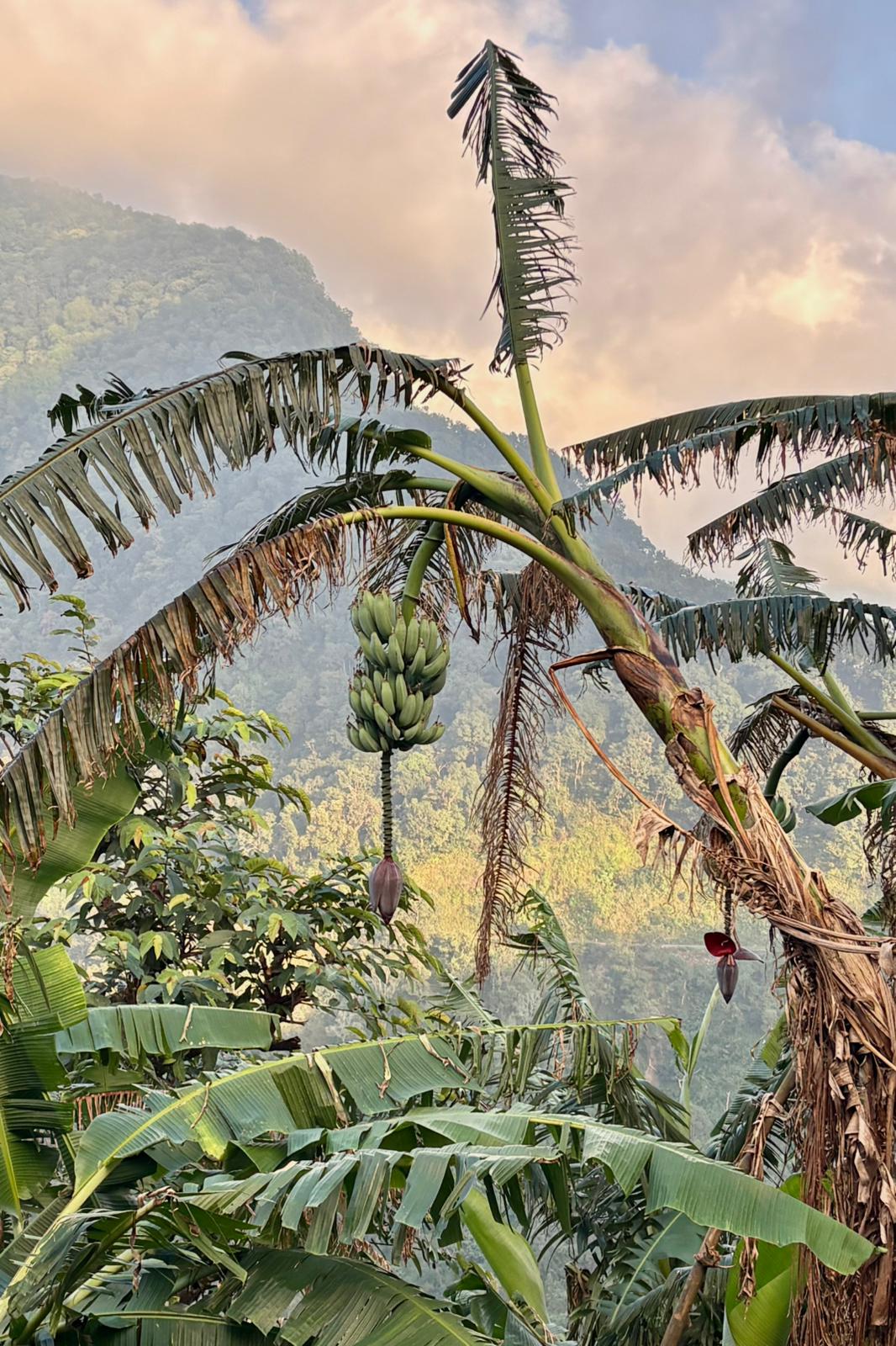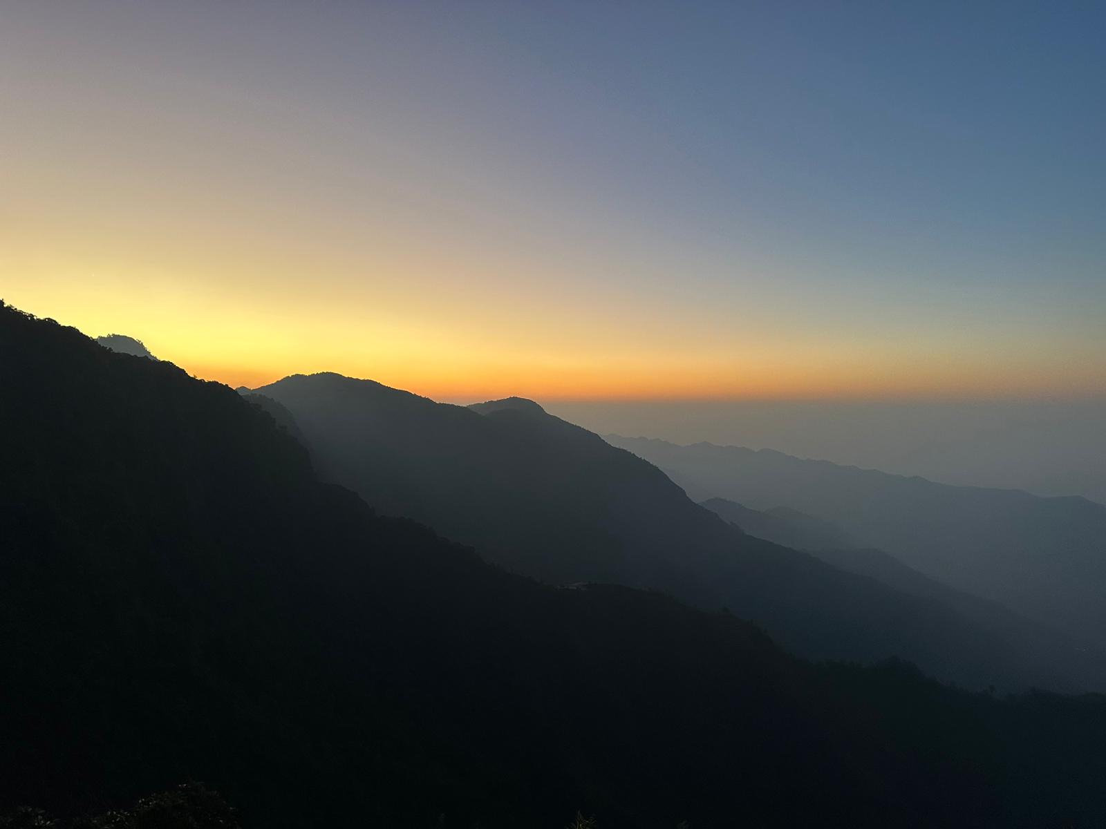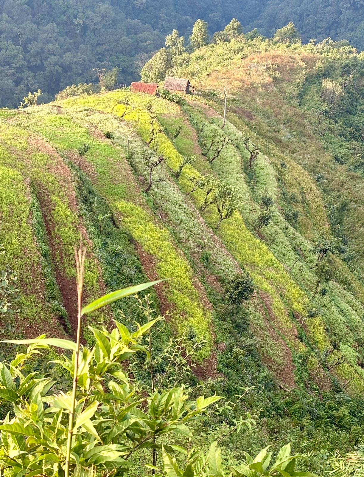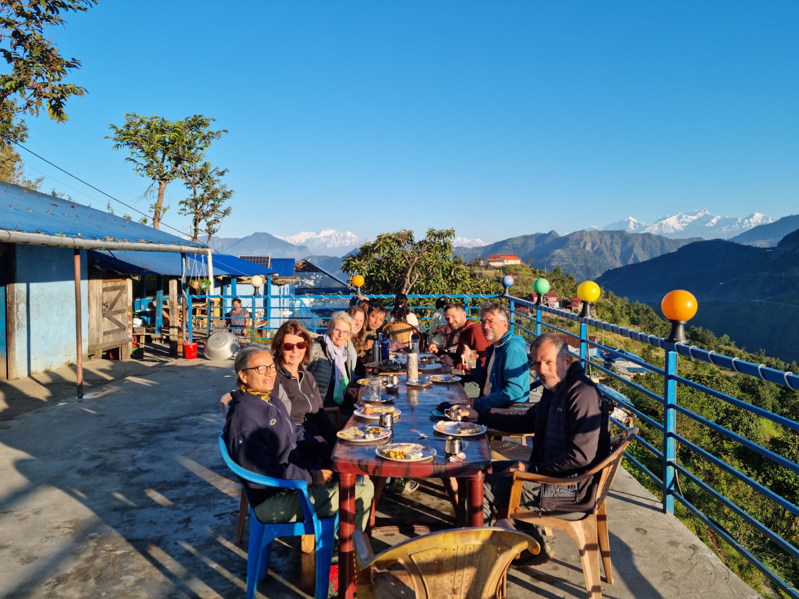 Ce matin on se réveille tranquillement avec le soleil, et le petit déjeuner prend des allures de festins avec les grenades préparées la veille qui subliment le mélange de porridge d’avoine au miel, muesli croustillant, graines de chia, noix et bananes. Le tout sur notre point de vue de bord de crête dont on ne se lasse pas. Puis on range le campement, et on termine la matinée par des petits temps de synthèse botanique, et la vérification de nos 2 premiers pièges-photos installés. En chemin pour vérifier le second, on a le plaisir de bien voir 5 à 6 Langurs du Teraï . Un dernier pique-nique et on quitte notre chouette camps de base, après quelques selfies de groupe pour le souvenir. La marche pour le prochain village se fait tranquillement, avec une pause pour caractériser l’habitat forestier de nouveau (cette fois le score est de 32 %, ce qui représente bien l’influence de la grosse piste et des activités humaines dans ce passage). On finit notre randonnée par une grande descente qui nous amène au village de Kaule, où nous sommes accueillis chez une famille avec des oranges cueillis dans leur jardin et du thé, lui aussi, cultivé dans le champs d’à côté. Kaule est un village incroyable, quasi auto-suffisant. On s’y promène de maison en maison, toutes très proches les unes des autres et séparées par de tout petits sentiers de terre, avec partout des fruits et légumes qui poussent en plein milieu du passage, ainsi que des poules, des chèvres, des buffles...et les habitants qui vivent sur leurs terrasses et nous accueillent avec de grands sourires. Après le thé, on s’installe et on a tout juste le temps de prendre une douche (au sceau et à l’eau froide) bien méritée et pour certains le temps de faire un peu de lessive avant l’heure du dal bhat. On a même la chance de goûter des « barela » !Effectivement, dans la descente vers Kaule, une dame s’est empressée d’offrir ces légumes à Jean-Marc qui les regardait curieusement. On les a donc donné à la famille qui nous les a cuisinés. Après un bon thé, chacun se prépare à dormir. Alors qu’il n’y avait plus que Annie, Sylvain et Catherine à table, Rupen leur fait remarquer qu’il y a une séance de shaman en cours car on entend les percussions au loin. De façon complètement improvisée, il les emmène voir la cérémonie pendant laquelle ils partagent le thé avec la famille, un grand moment de vie d’une autre culture, passionnant.