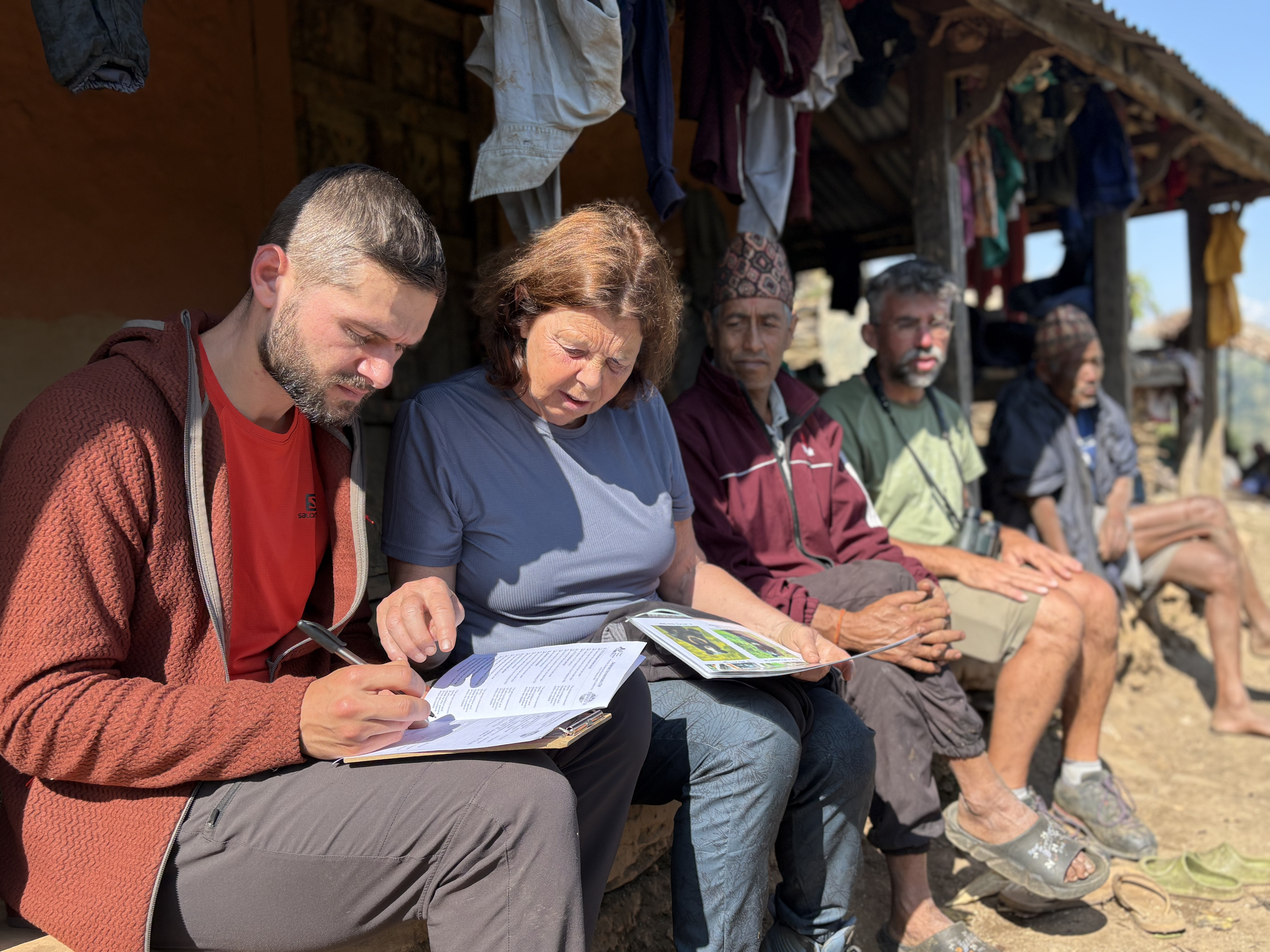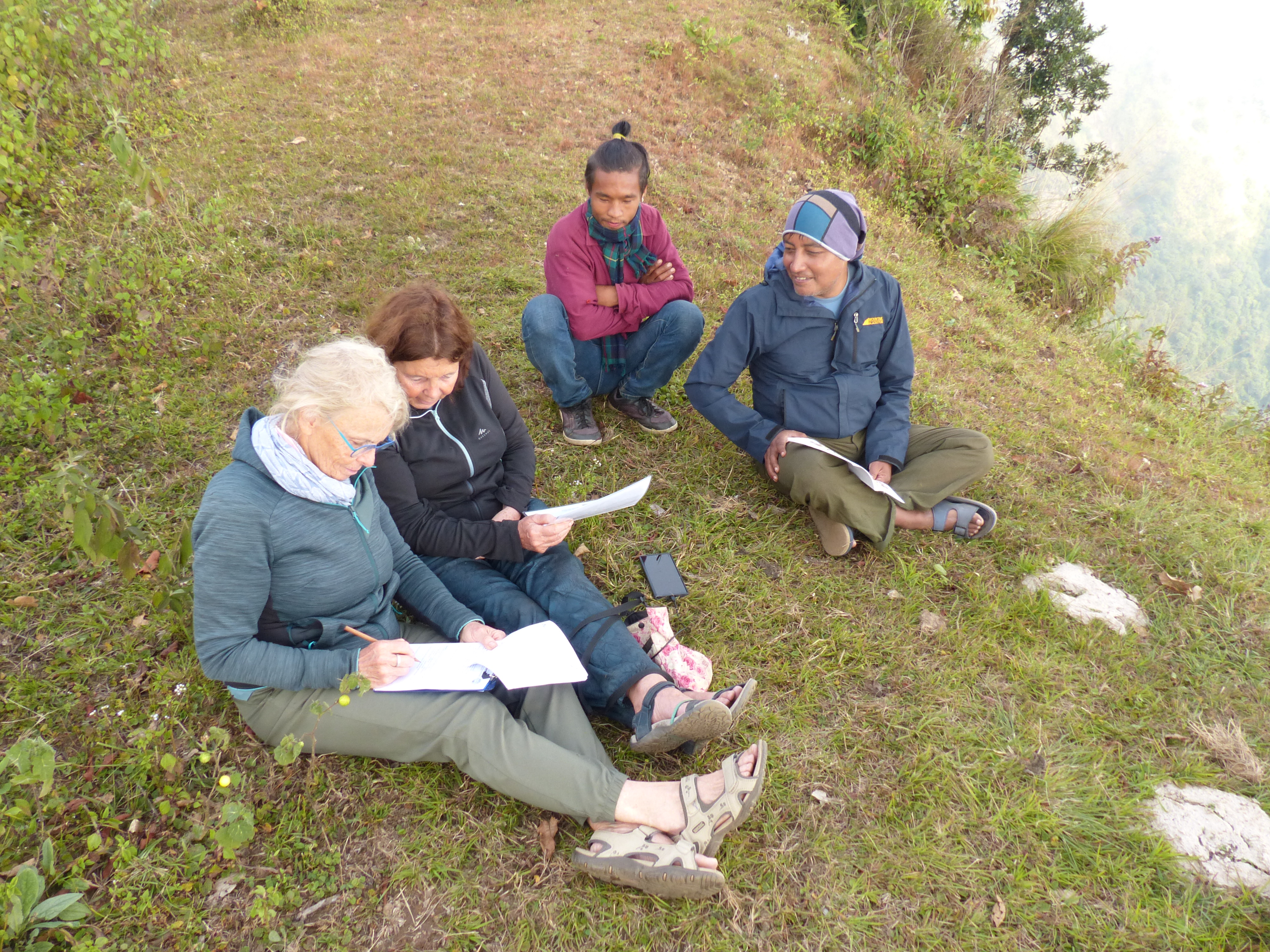 Puis nous allons tester notre tout nouveau projet d’interview systématique des habitants pour récolter des informations sur la faune locale. Rupen, Annie et Sylvain s’en vont donc interroger la dame qui semble habiter la maison la plus proche de nous avec la fiche d’information à remplir. Très vite, c’est toute la famille qui s’attroupe autour des photos qu’on leur montre et tout notre groupe qui vient profiter de ce bel instant de vie et de lien avec les locaux. Les photos les rendent très bavards et Rupen nous fait la traduction. On apprend ainsi la présence régulière de 4 Gaurs (les plus gros bovidés du monde, jusqu’à 2mètres et plus de hauteur au garrot !) dans leur village ! Après cette belle discussion, la famille nous offre des toutes petites châtaignes récoltées et grillées pour nous. Puis Rupen nous montre comment le maïs est laissé séché au plafond, puis écrasé sous une meule (on s’y essaye pour voir ce que ça donne). Nous repartons en cheminant tranquillement en faisant une belle boucle avant de revenir au village de Gadhi vers 16h30. La soirée se passe tranquillement en temps libre – boissons chaudes sur la terrasse – douches etc en attendant le dal bhat du soir.