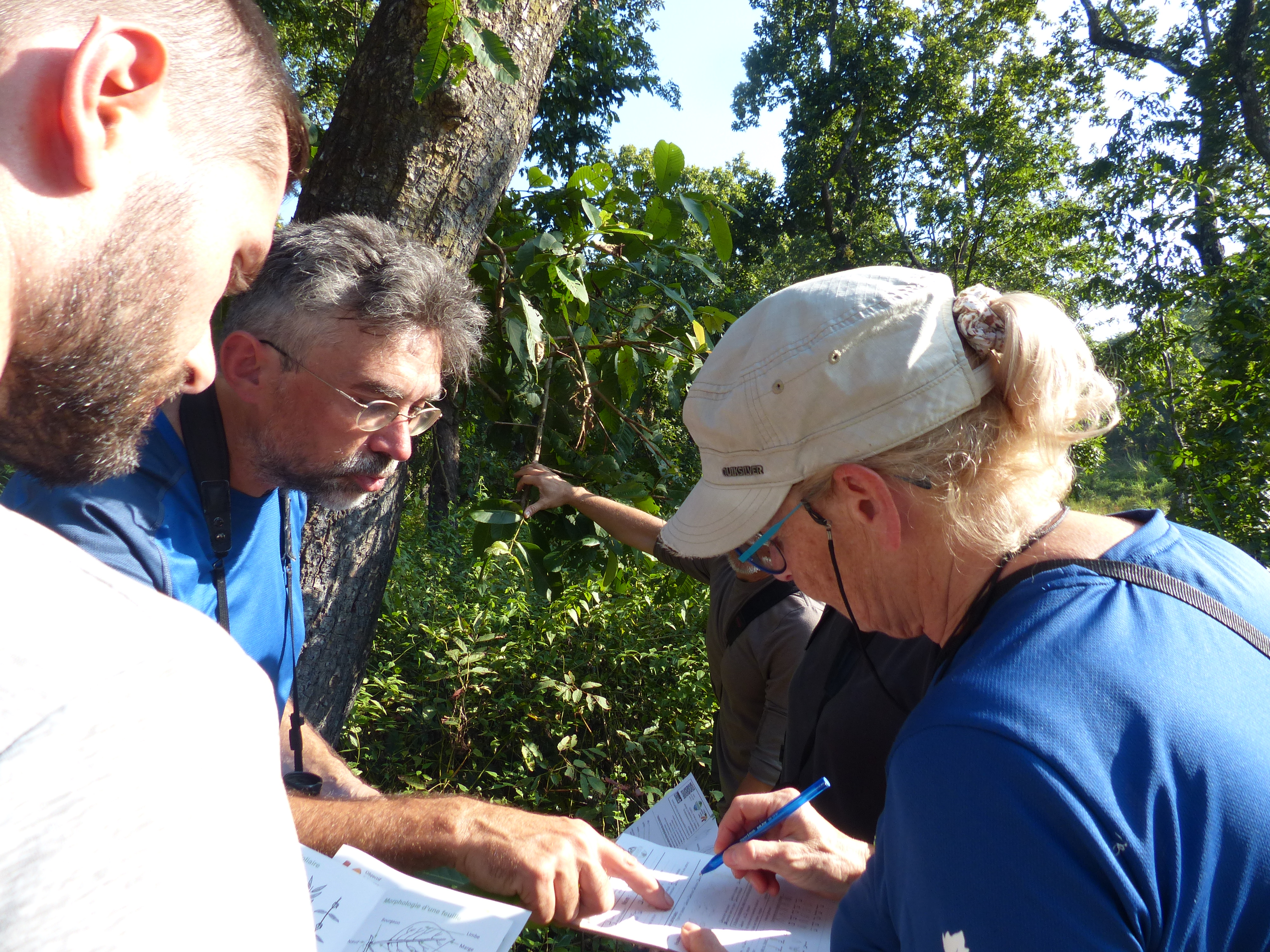 C’est à cet endroit que l’on décide de faire notre initiation botanique. Après l’analyse de plusieurs rameaux sur lesquels nous apprenons un peu de vocabulaire basique, on se lance dans une clé d’identification créée de façon participative avec les groupes des séjours précédents. On identifie ainsi le Sal tree, arbre dominant de cette jungle. Puis nous caractérisons un nouvel arbre : « Terminalia tomentosa » en remplissant sa fiche de description. C’est un arbre dont on connaît le nom scientifique, mais nous n’avions pas encore eu l’occasion de remplir sa fiche descriptive car les feuilles se trouvent trop souvent hors de portée. Voilà qui est fait, et nous voila repartis en jeep pour rentrer à l’hôtel avec encore une fois, plein de belles observations en chemin.