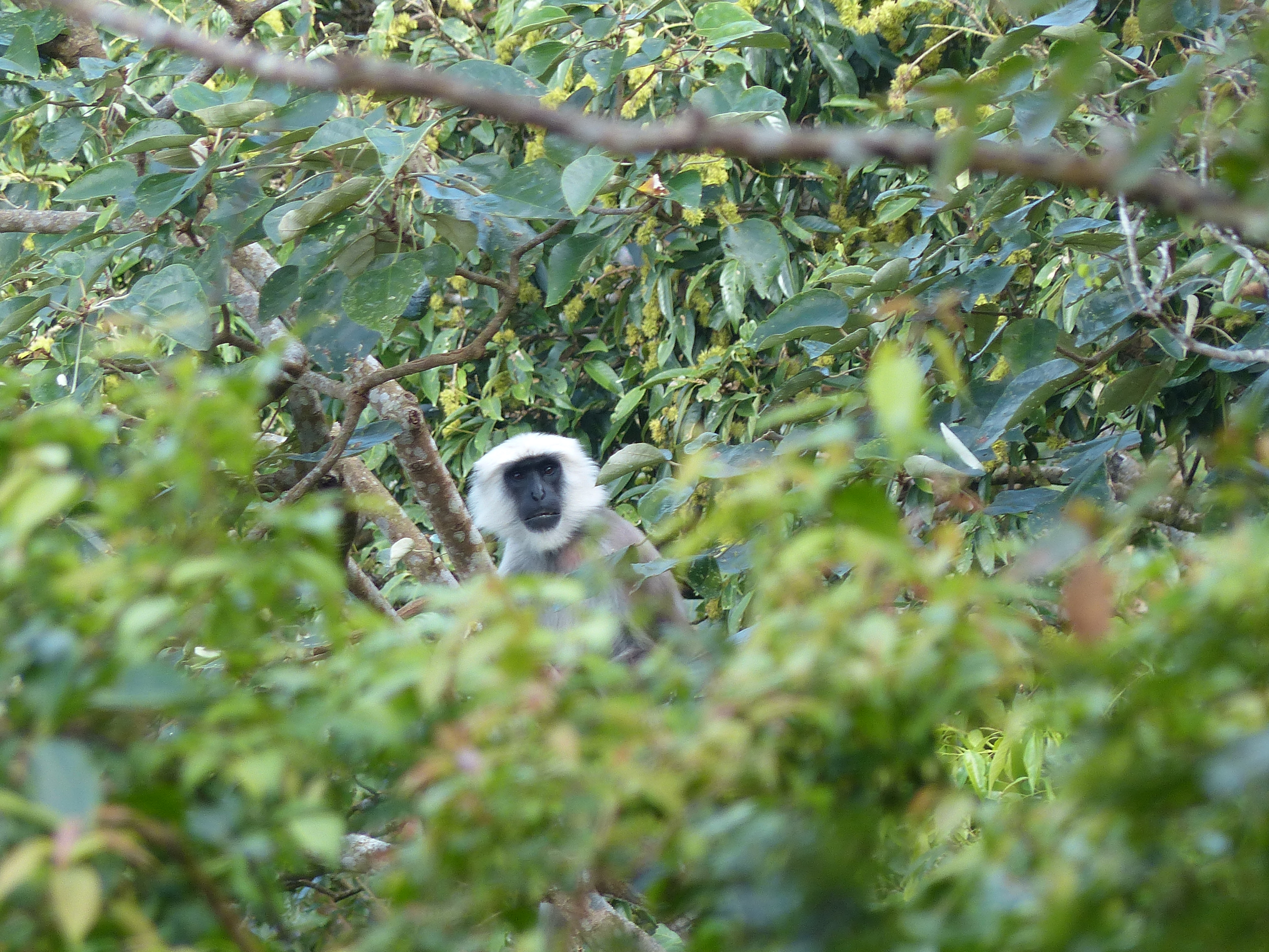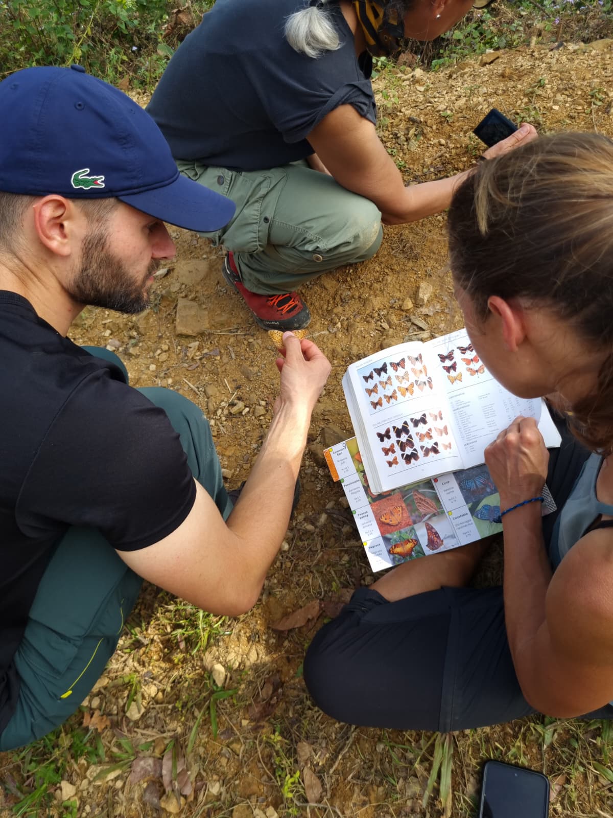 Une belle observation : le Roselin sombre, encore jamais répertorié dans les Chepang, donc une donnée exceptionnelle. Nous avons aussi la chance de très bien voir une chouette posée tranquillement sur sa branche à nous regarder (son nom d’espèce n’est pas encore sûr, nous ferons confirmer par Tikal, l’ornithologue local, à notre retour à Chitwan). Et pour le plaisir des yeux, un Langhur du Teraï et un énorme groupe de Macaques Rhésus. Nous finissons ce transect peu avant midi au village de Kapé, où Gothe nous attend avec le pique-nique (de luxe !). Servis avec assiettes et couverts : riz aux légumes et patates sautées et omelette encore chauds, ainsi que fruits ! Place ensuite à l’initiation chasse aux papillons sur place.