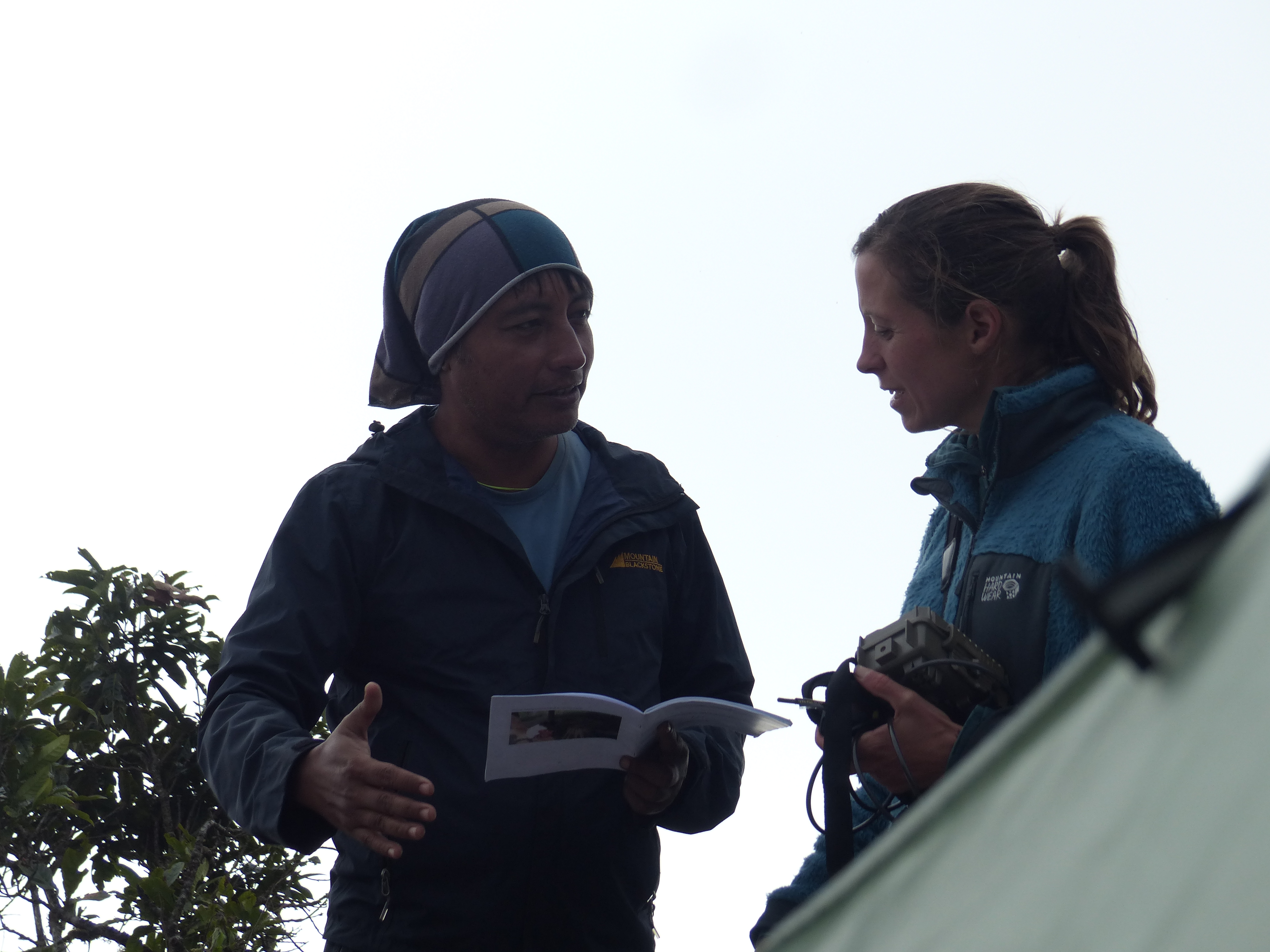 Comme la dernière randonnée est une assez longue descente, Annie et Brigitte préfèrent prendre leur temps ce matin à Gadi, et descendre avec la jeep qui récupérera les gros sacs d’équipement. Elles en profitent pour faire une interview mammifères avec un des membres de l’équipe du cottage qui parle anglais. Super initiative !