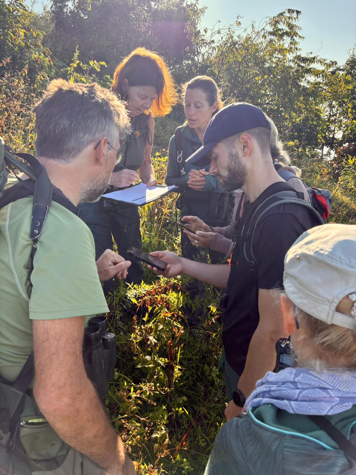 Rupen et Nicolas repèrent les oiseaux aux jumelles, suivis par Sylvain qui tente de les photographier, puis de Brigitte qui enregistre tous les cris et chants, d’Alexis qui enregistre avec l’application Merlin pour aider à orienter les identifications possibles, de Jean-Marc qui tient prêt le livre d’ornitho de référence ainsi que les fiches de terrain de description des oiseaux inconnus, et enfin le binôme qui dépote : Annie sur la prise de données papier et Evelyne sur la prise de données numérique (via l’application Obsmapp), et Catherine qui chapeaute le tout pour assurer que les informations aient bien circulé dans l’ensemble du groupe.
